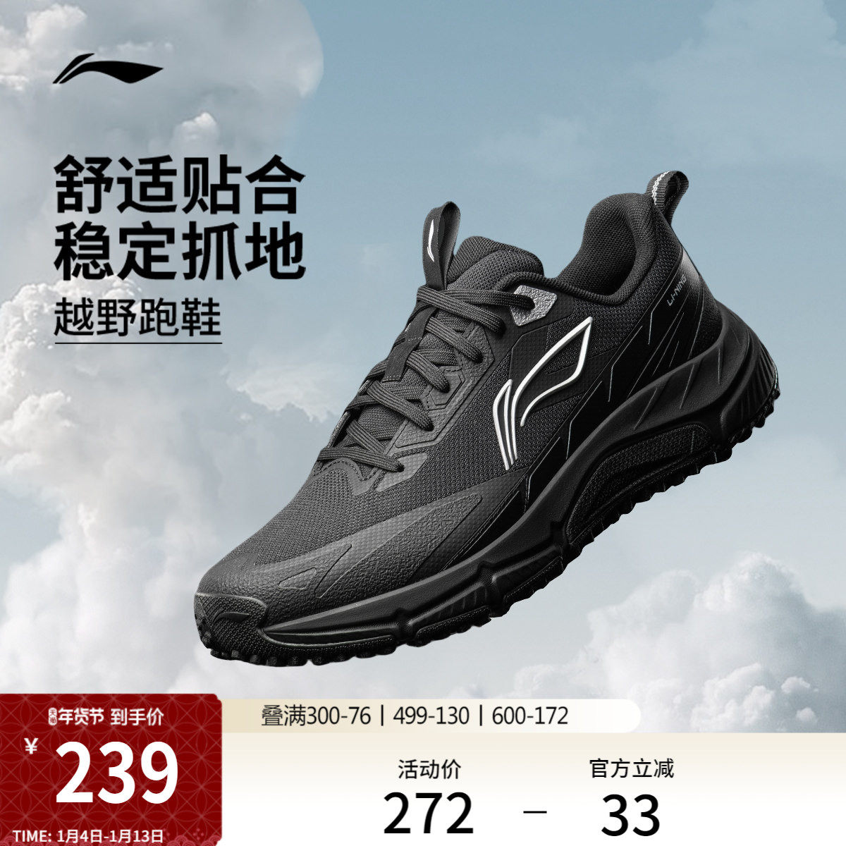 李宁逐风丨越野跑步鞋男鞋新款户外徒步登山鞋减震黑色山系运动鞋