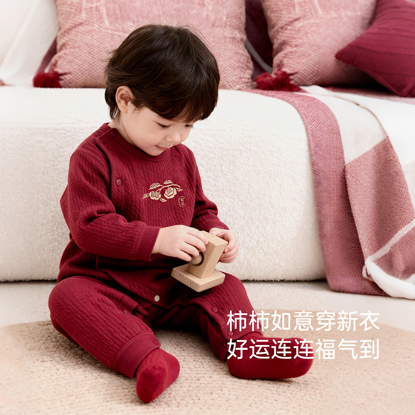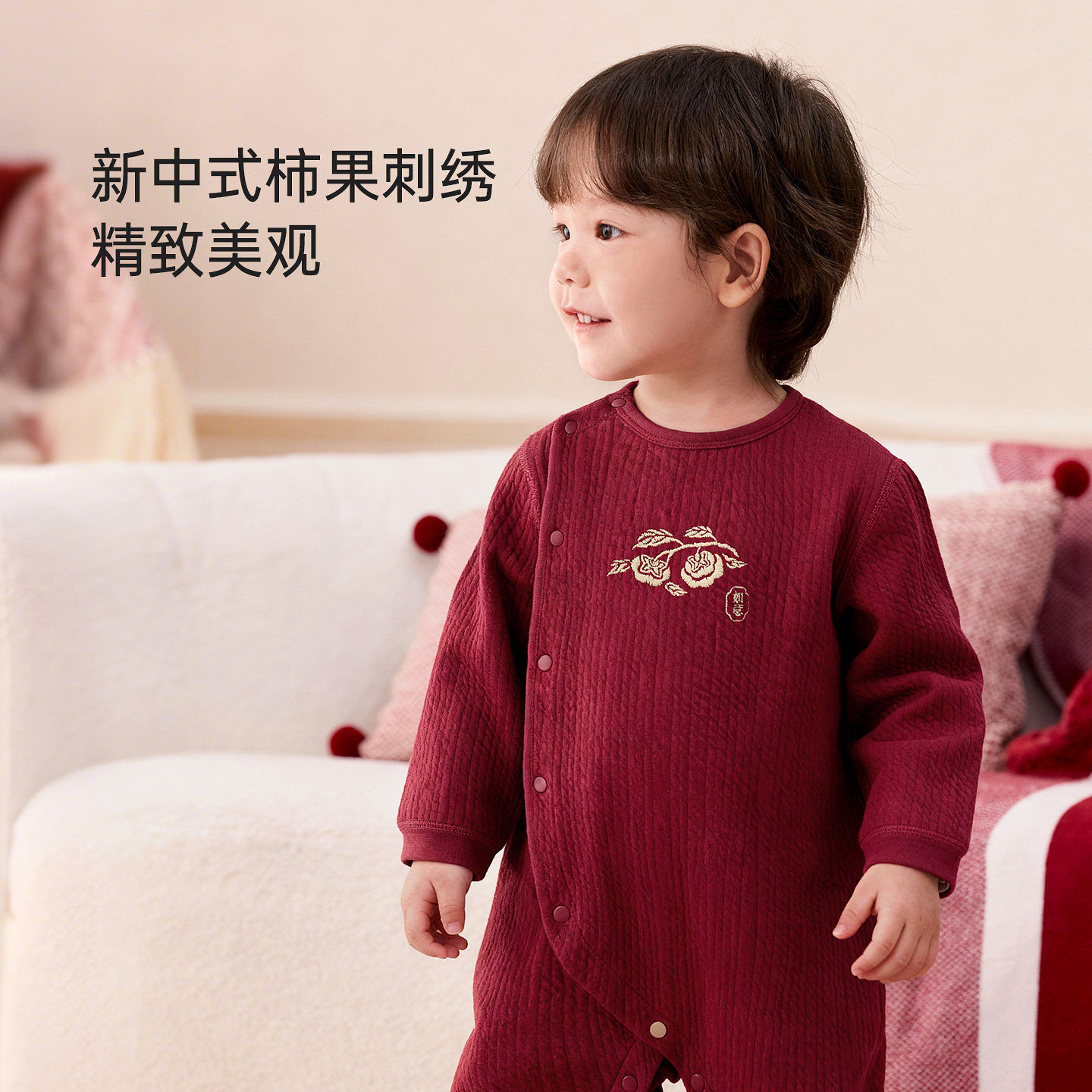 babylove婴儿薄夹棉连体衣秋冬季保暖哈衣爬服红色拜年服金柿如意