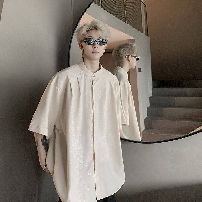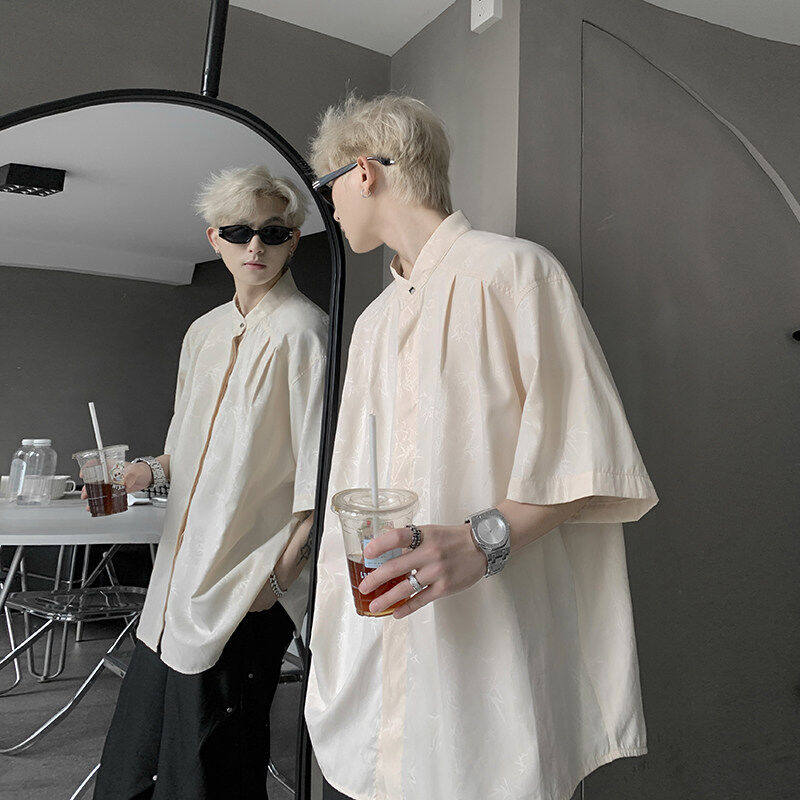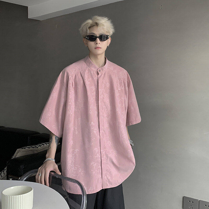 新中式国风粉色衬衫潮牌痞帅炸街短袖外套男款夏季冰丝五分袖衬衣
