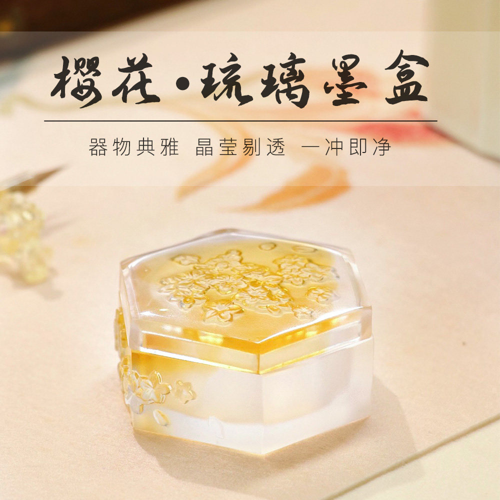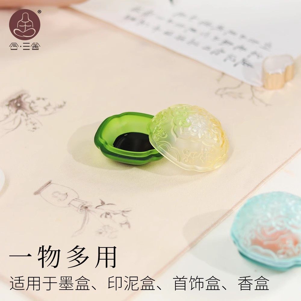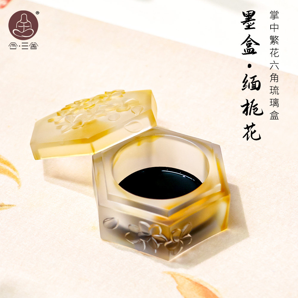 合三舍 繁花六角琉璃墨盒 不易干墨带盖砚台文房四宝保湿墨池书法国画适用古法手工可盛墨水晶小砚池掭笔墨海