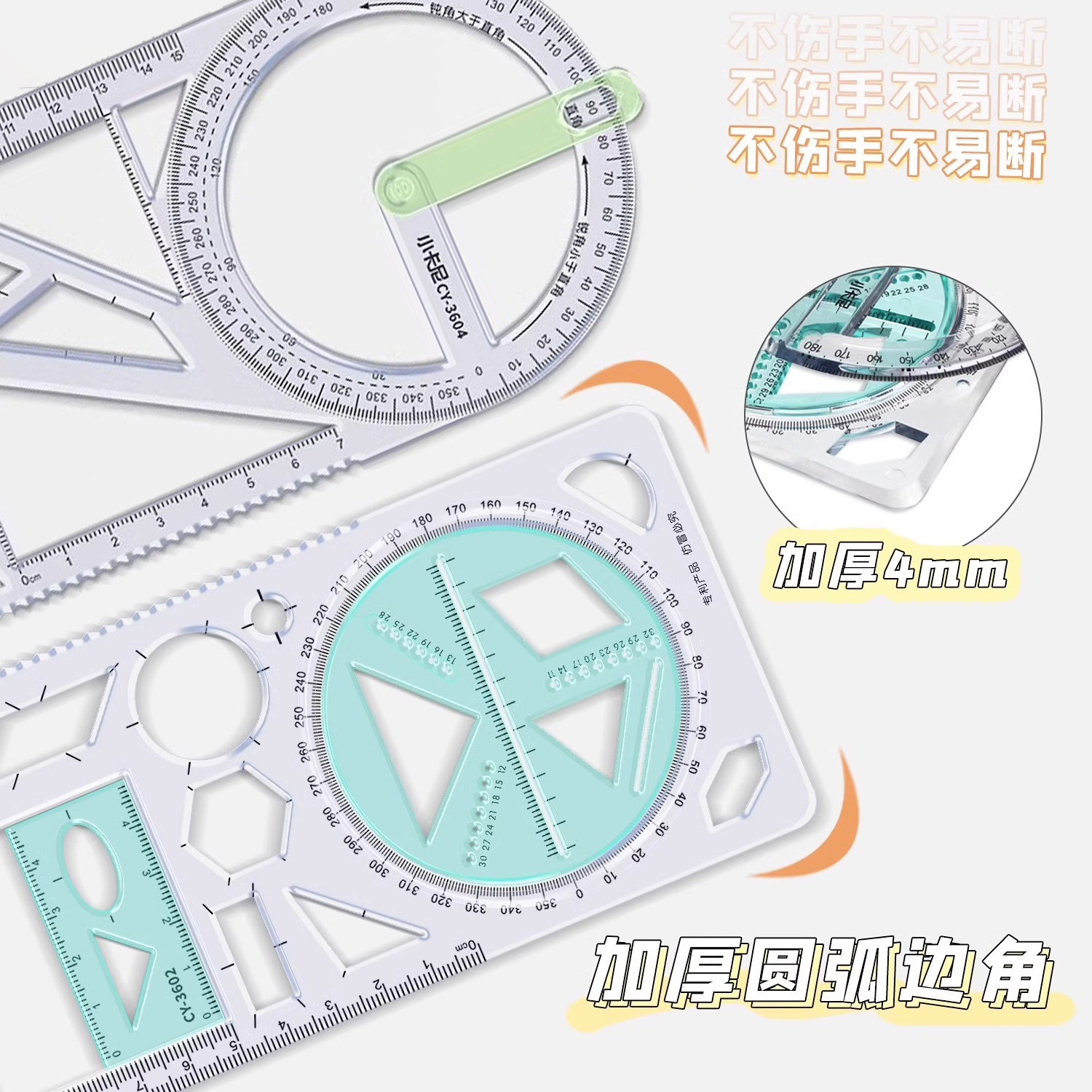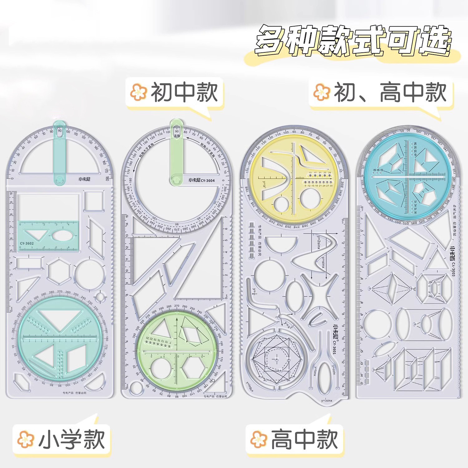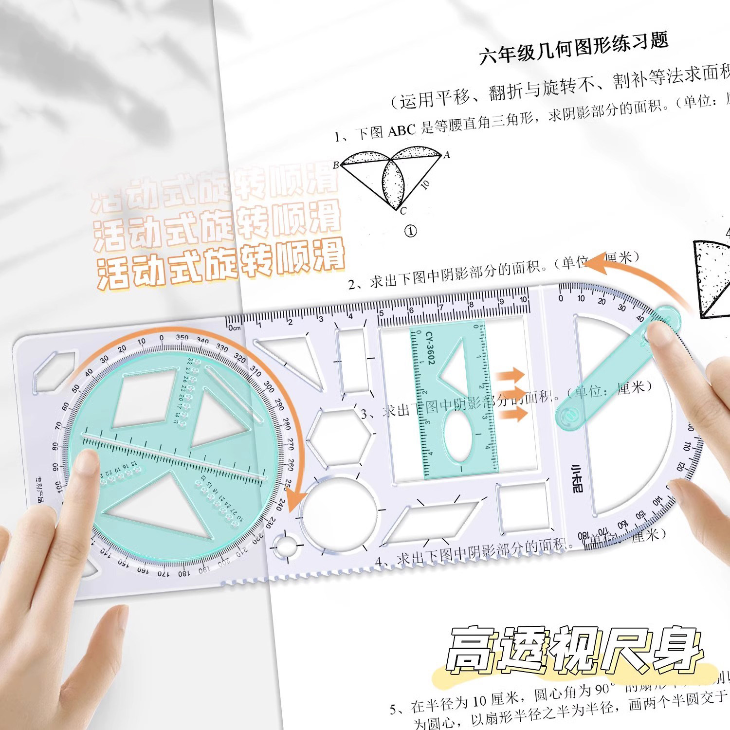 多功能绘图尺子中小学高中生可旋转数学函数几何图形尺套装三角直尺抛物线椭圆套尺量角圆规画圆神器透明模板