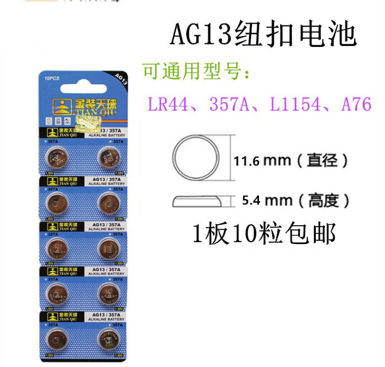 LR44纽扣电池AG13/A76 L1154 357a电子手表玩具遥控器计算机sr44wh小型号1.5v伏碱性通用式游标卡尺