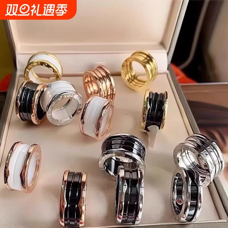 陶瓷小众V金镀18K小蛮腰弹簧戒指女小红人黑白陶瓷男女情侣对戒
