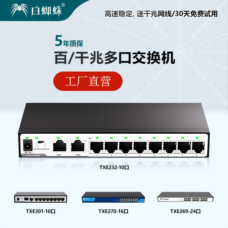 白蜘蛛商用交换机宽带交换器5口10口8口16口24口百兆千兆以太网网络监控校园家用宿舍箱网线分线集线器带VLAN