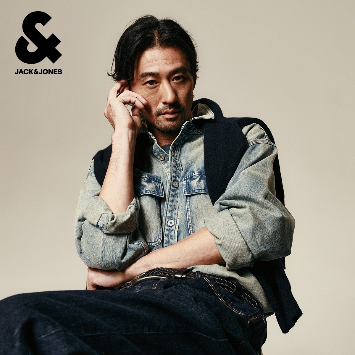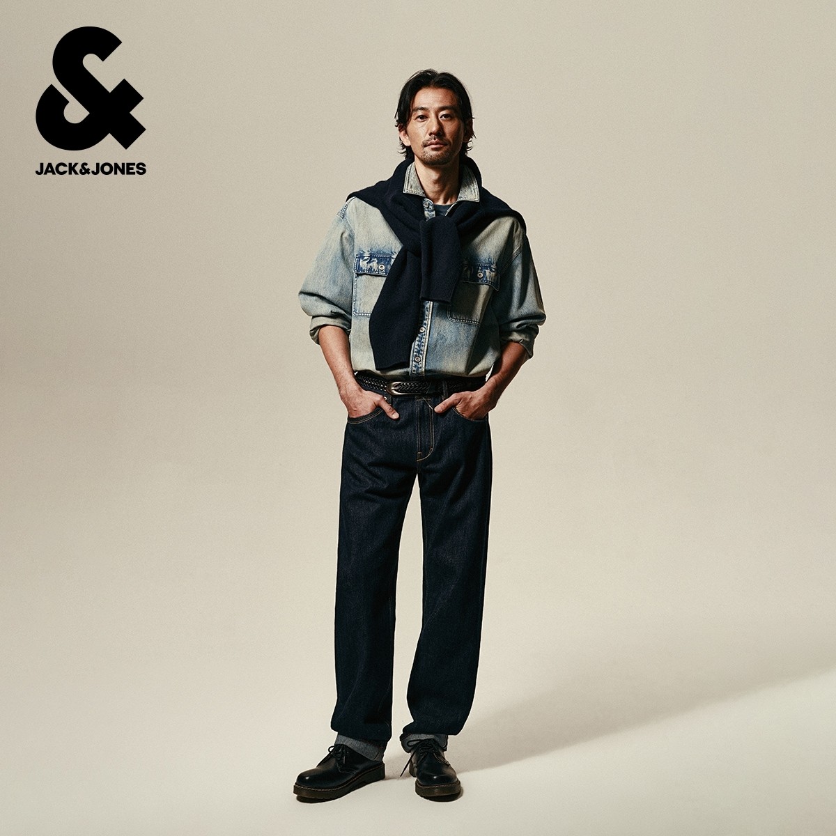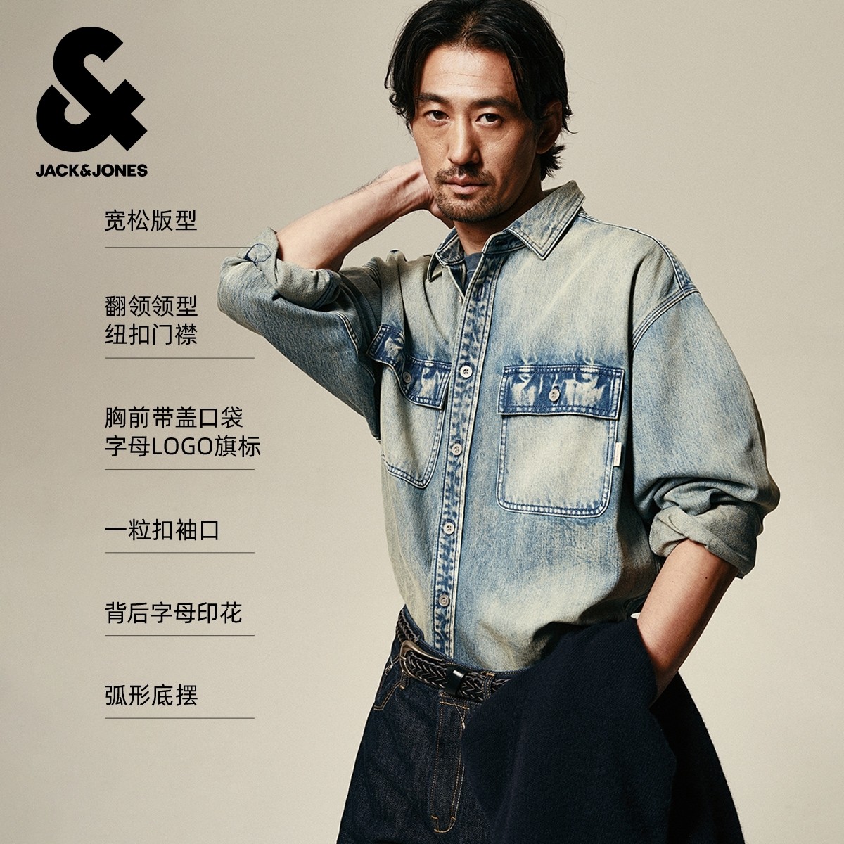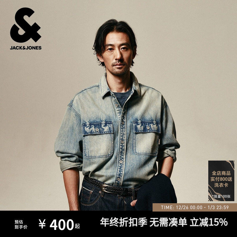 杰克琼斯男装秋季衬衫外套上衣翻领宽松版型水洗字母刺绣牛仔面料