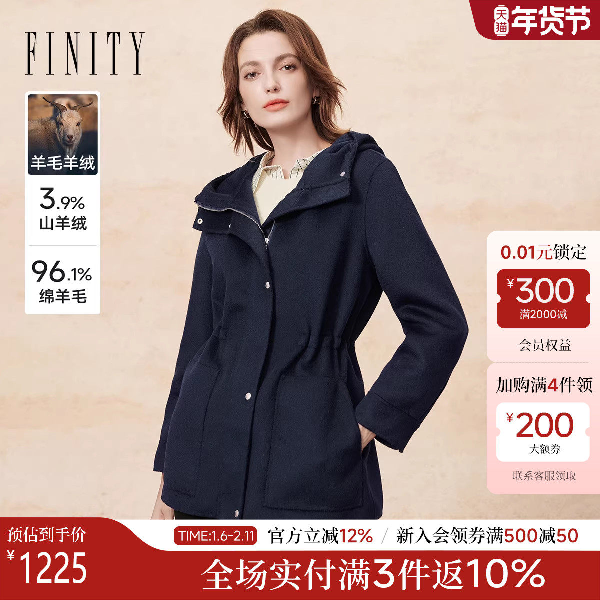 FINITY菲妮迪羊绒大衣2025年冬季新款简约双面呢连帽毛呢外套女士