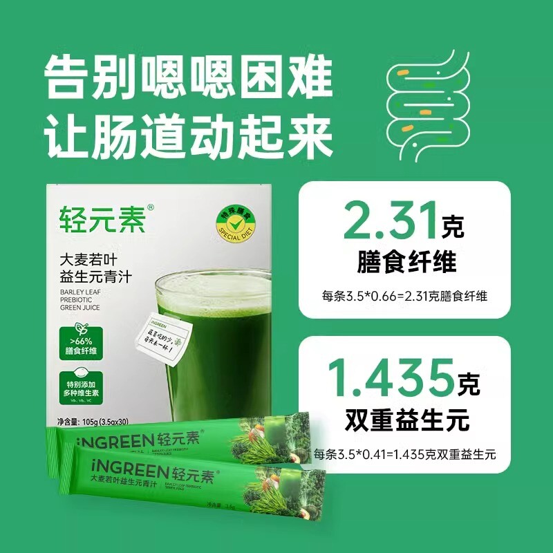 轻元素大麦若叶青汁30条益生元高膳食纤维代餐冲饮官方旗舰店正品