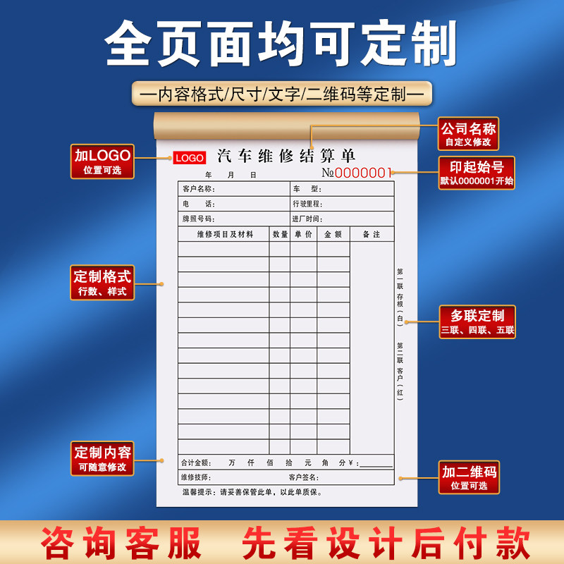 修理厂维修清单二联汽修店接车单汽车施工记录本车辆保养结算单据