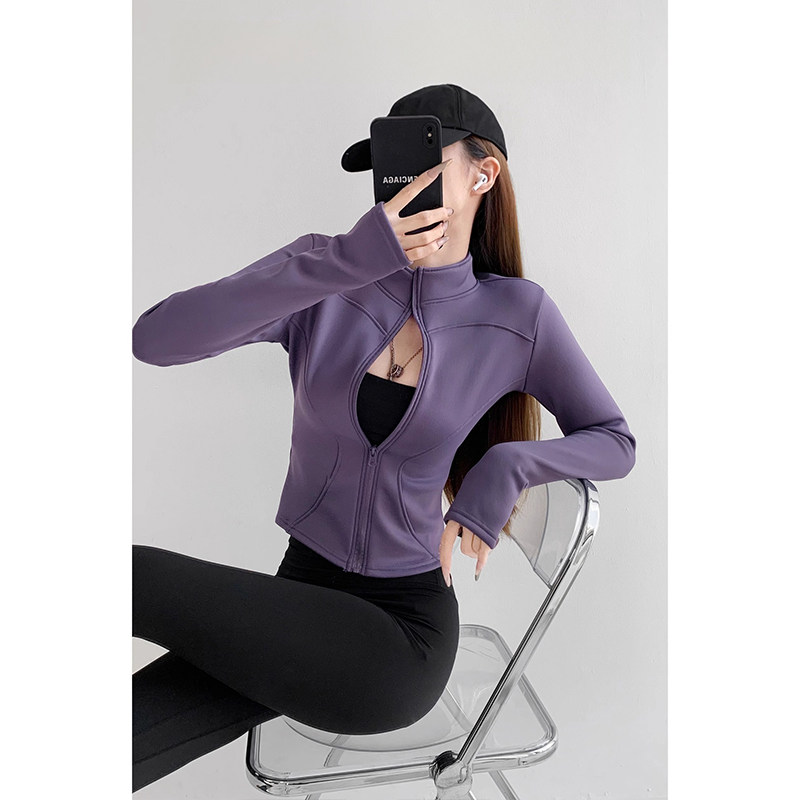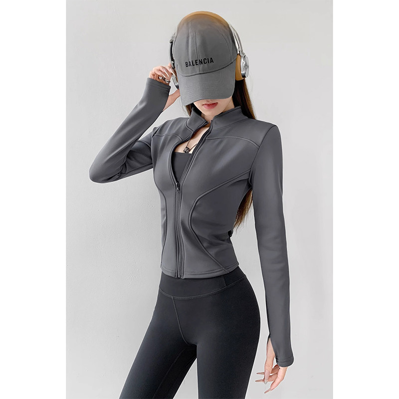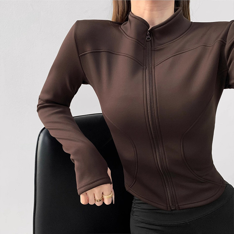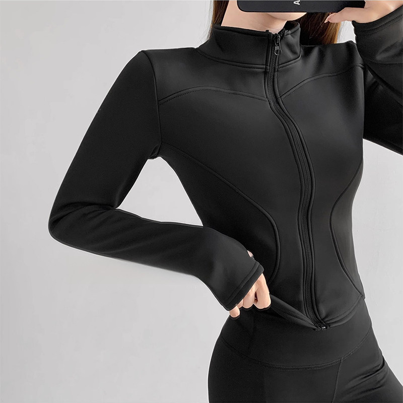 立领加绒运动外套女收腰显瘦健身服弹力瑜伽服加厚上衣秋冬款微胖