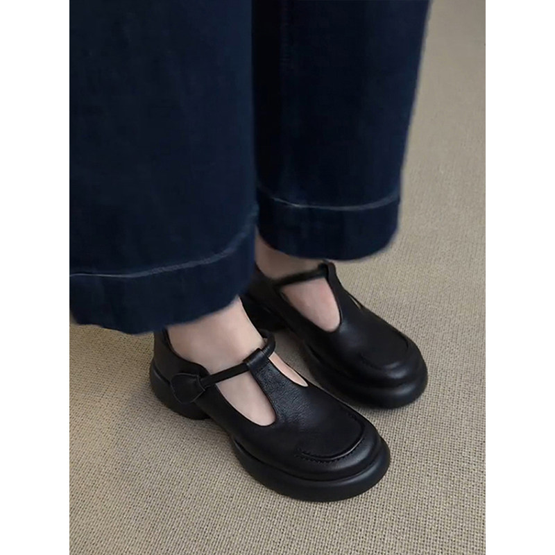 牛皮版~真皮复古简约圆头厚底玛丽珍鞋女通勤百搭黑色小皮鞋单鞋