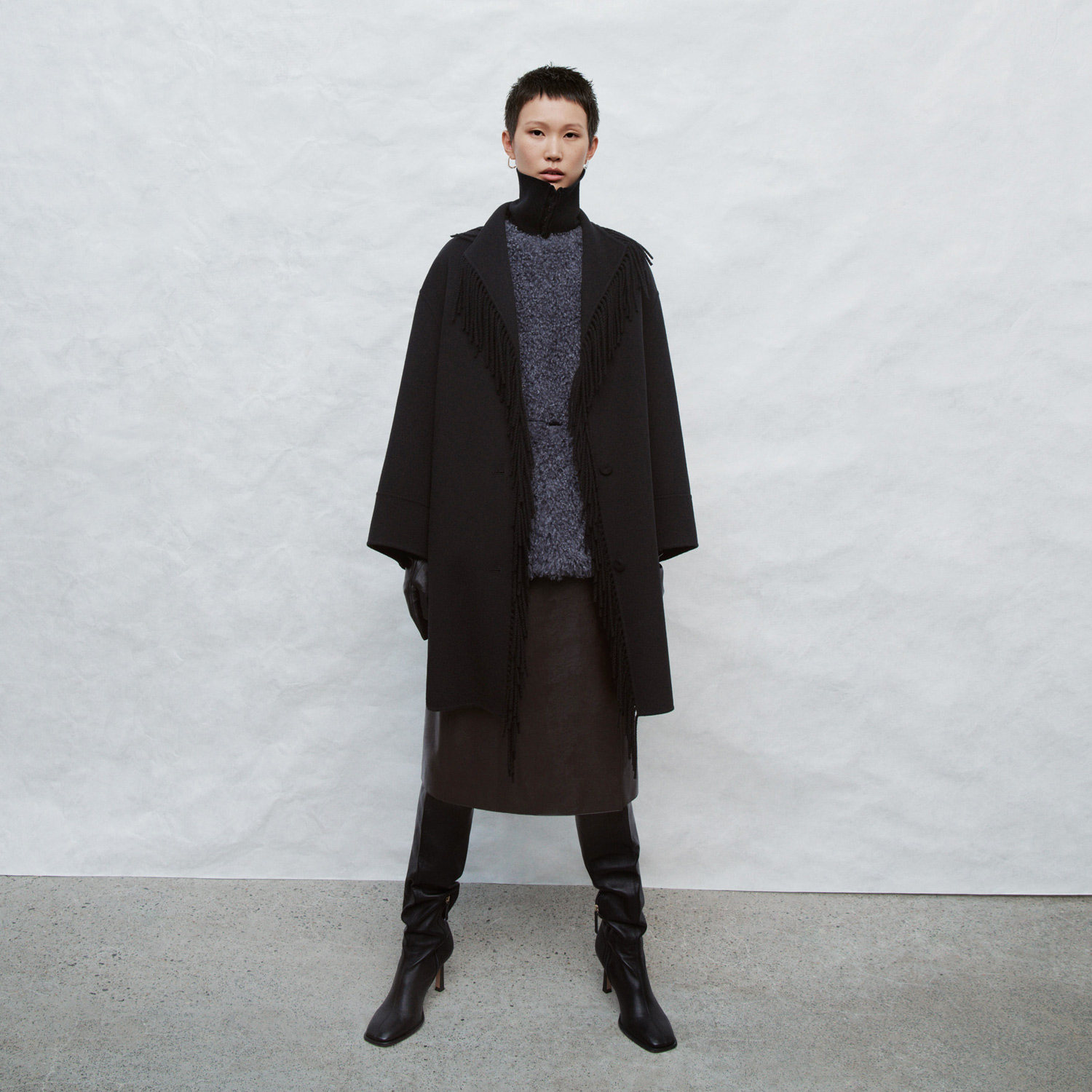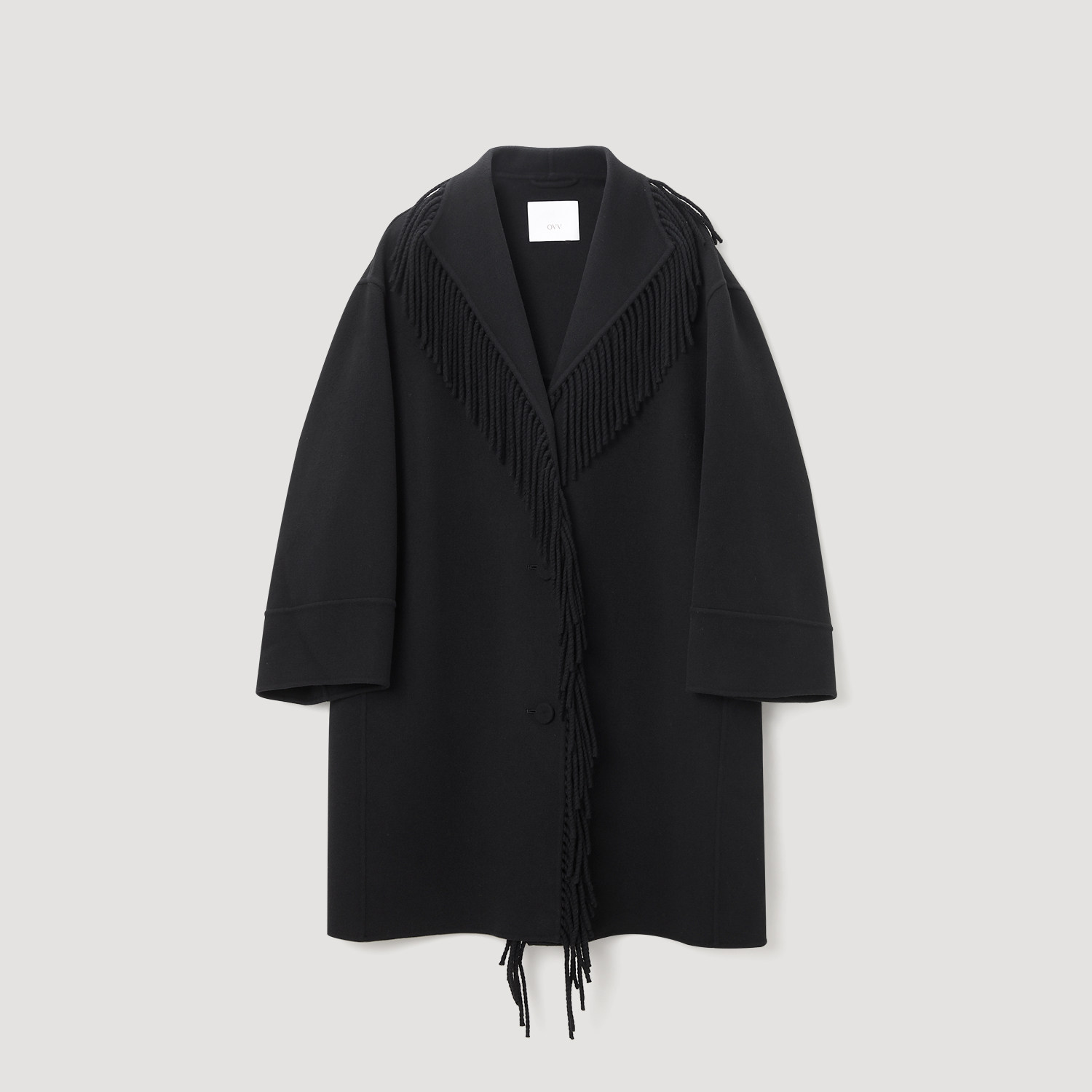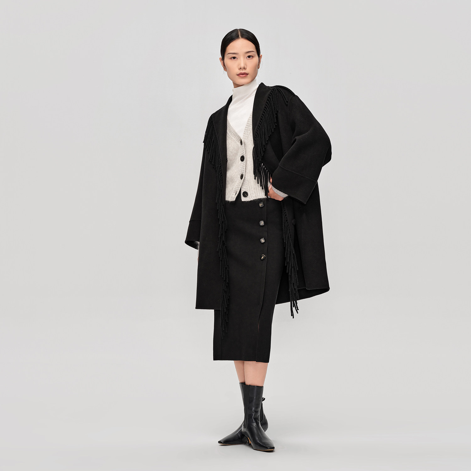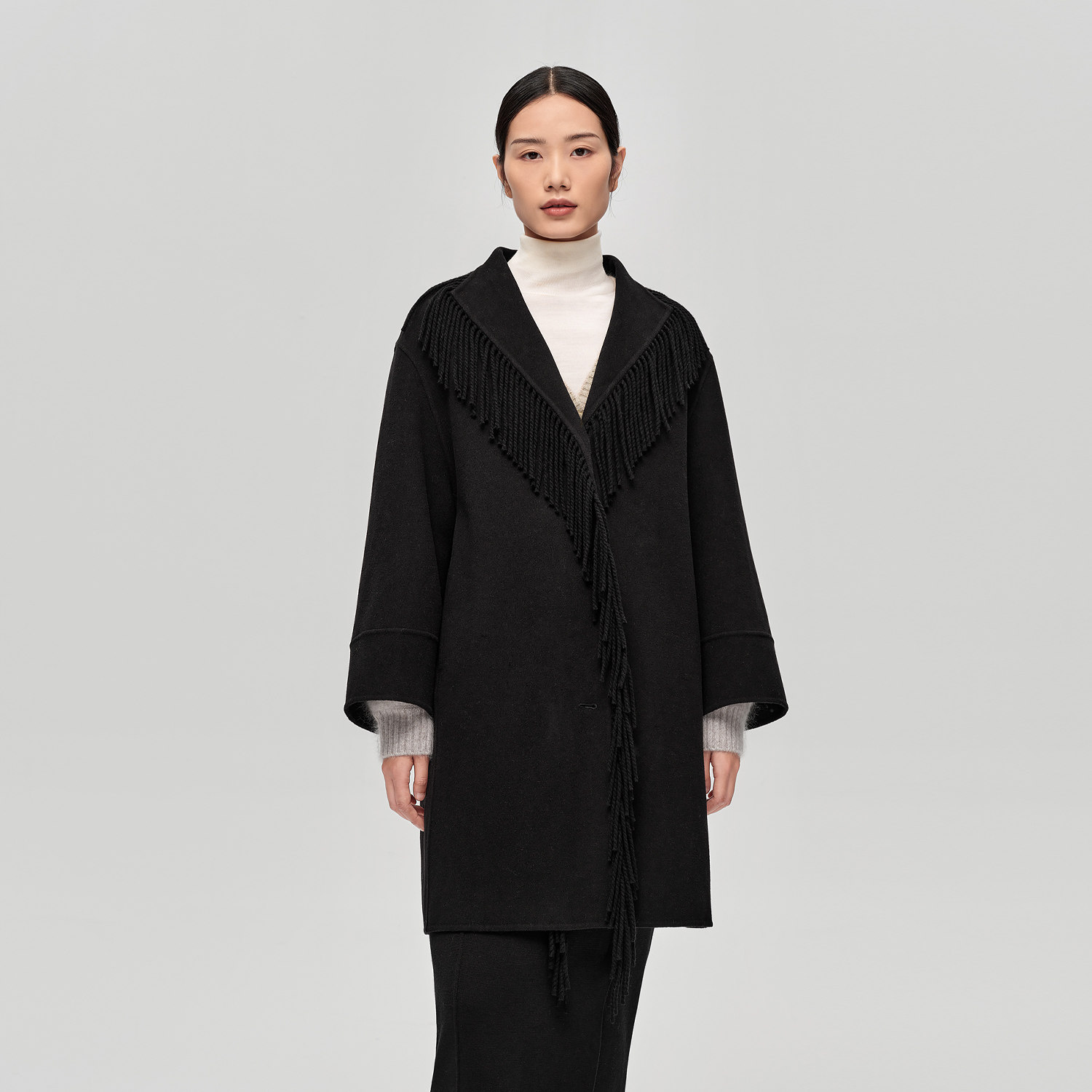 OVV秋冬新款女装流苏装饰边高支羊毛双面呢中长款大衣