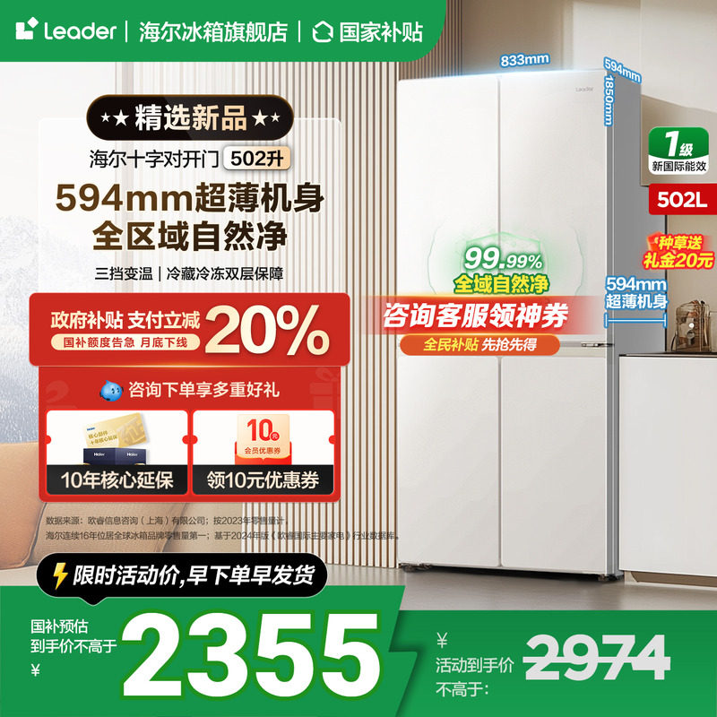 【国补告急】海尔出品统帅冰箱502升十字四开门一级变频官方正品