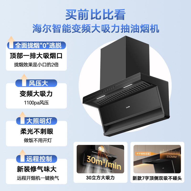 海尔出品统帅变频顶侧双吸Q30家用燃气灶具套装清洗大吸力油烟机