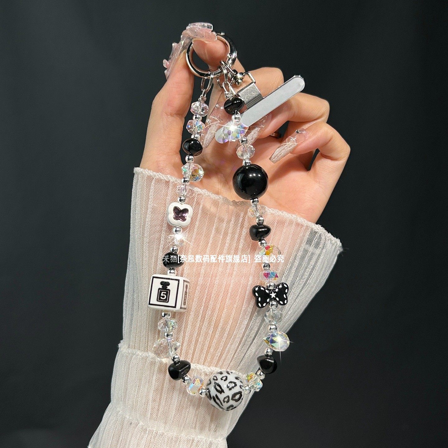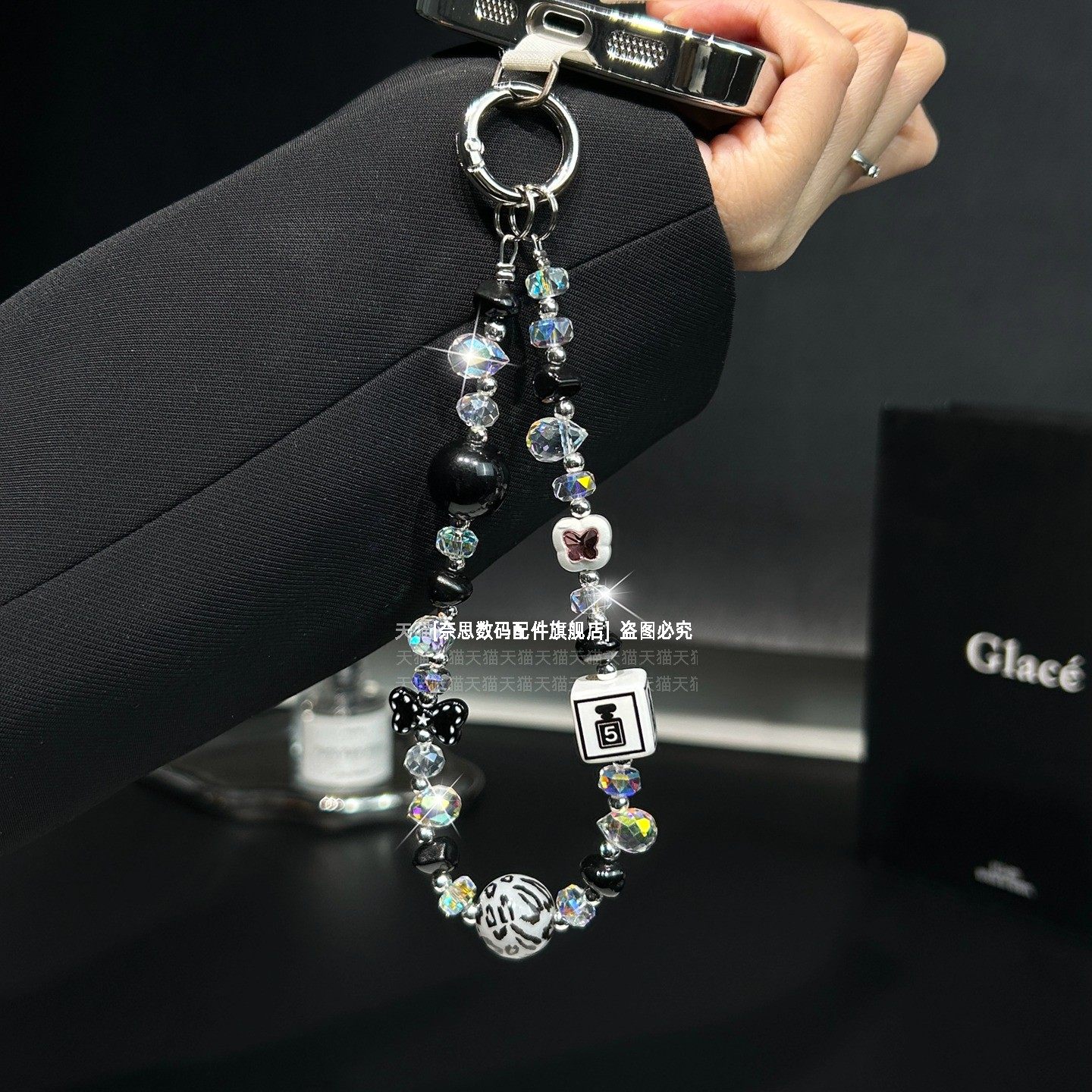 高级感黑白系手机链大牌小香风时尚手腕链条挂饰精致水晶蝴蝶串珠挂链小众简约气质防丢手链女垫片包挂钥匙壳