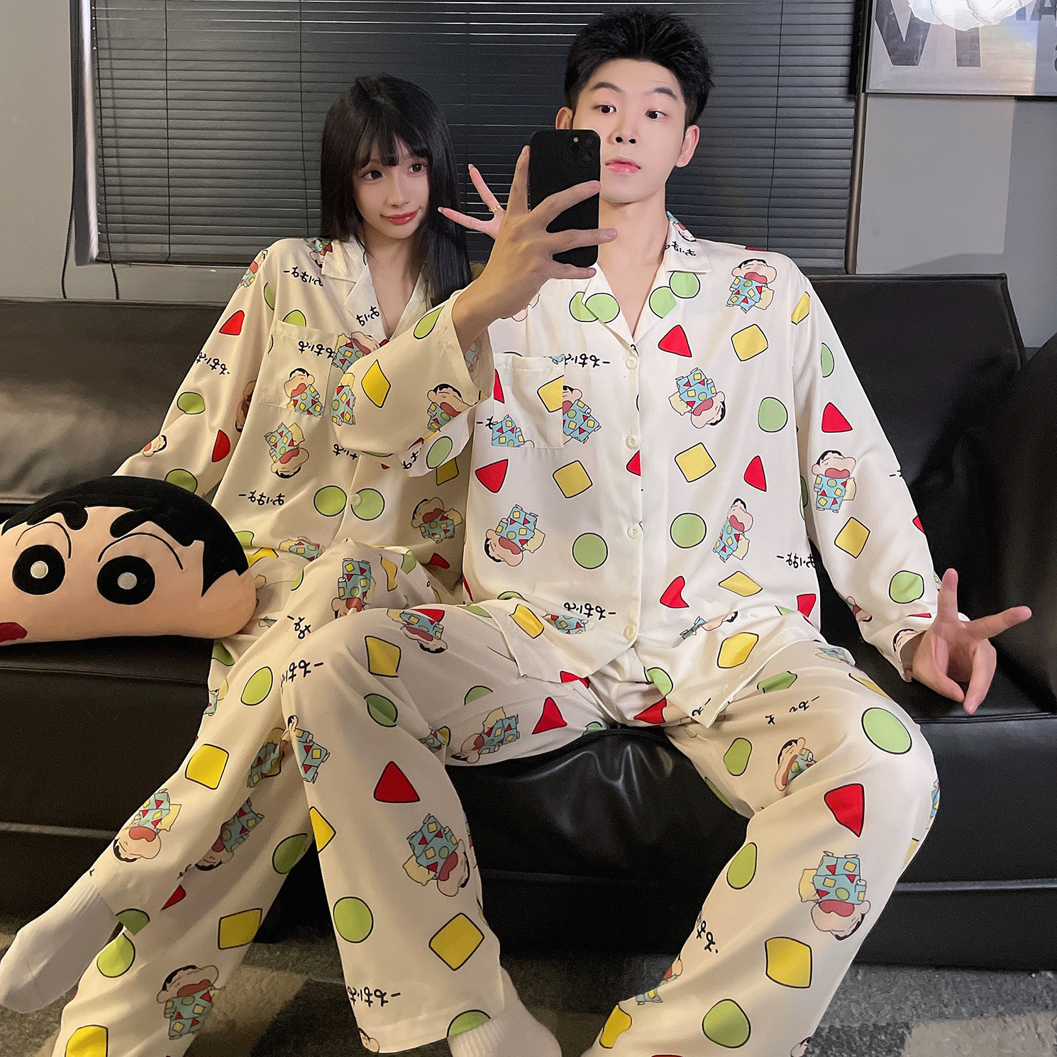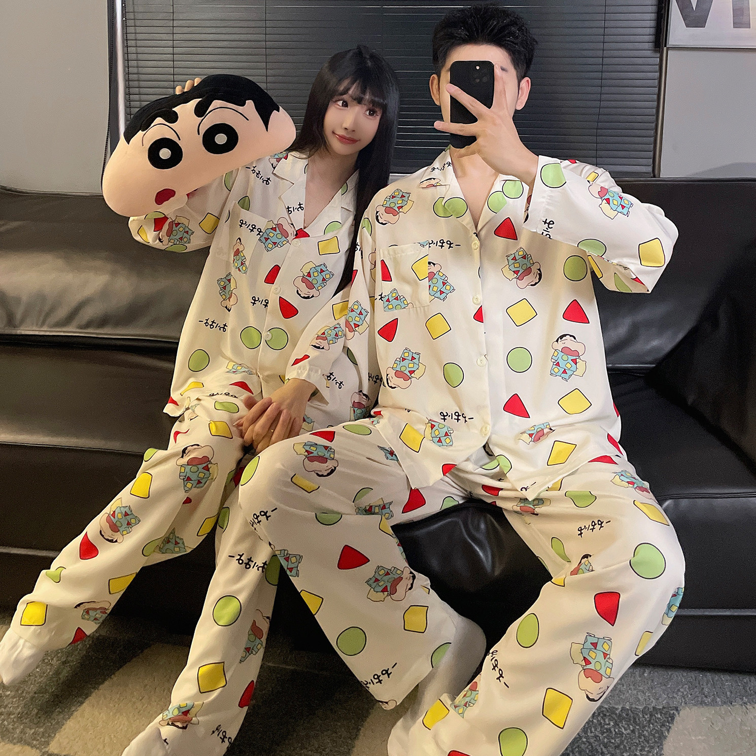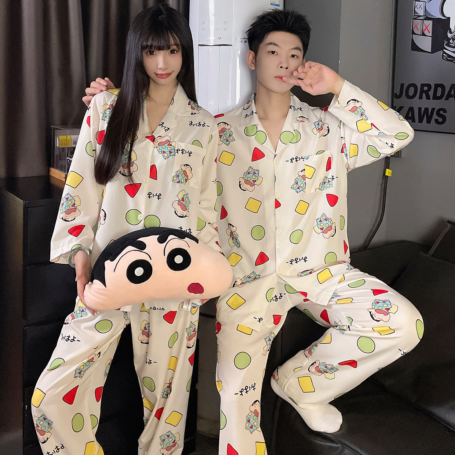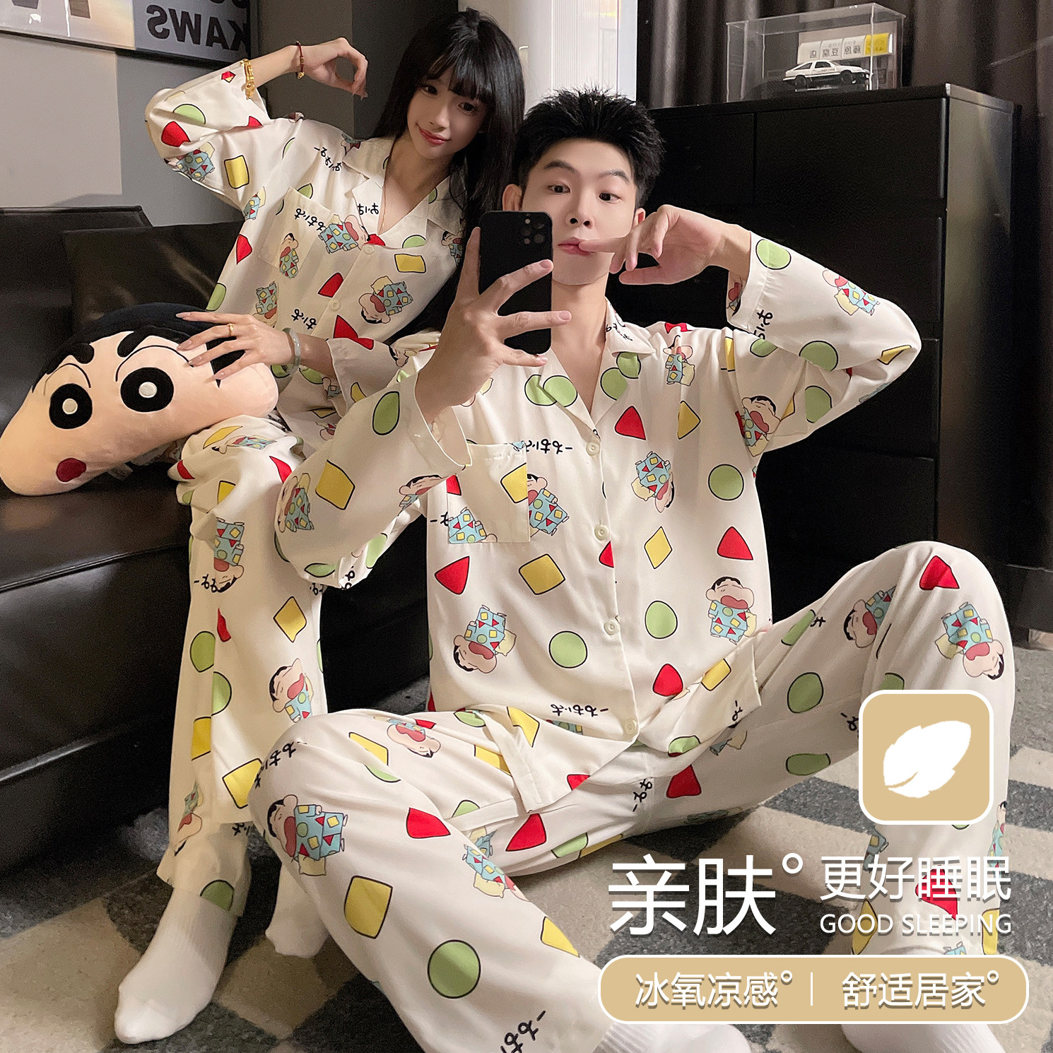 冬梧春秋季情侣睡衣女冰丝长袖薄款蜡笔小新家居服男士卡通套装