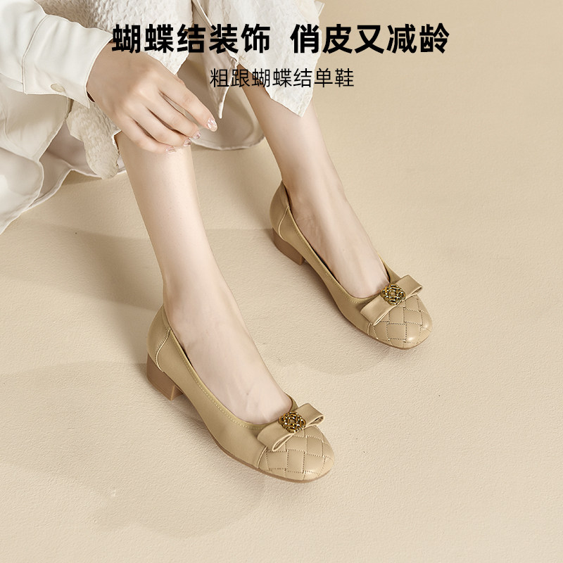 米霏~真皮奶奶鞋女粗跟2026春款法式单鞋中跟浅口晚晚鞋大码女鞋