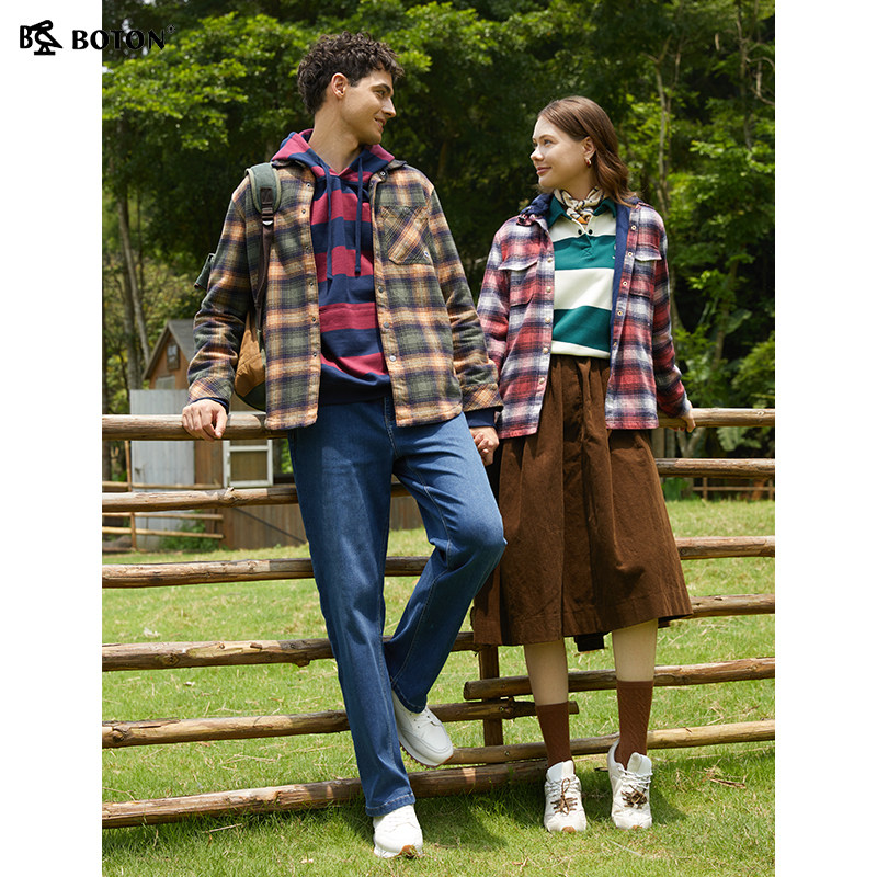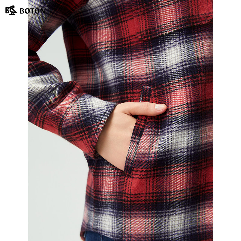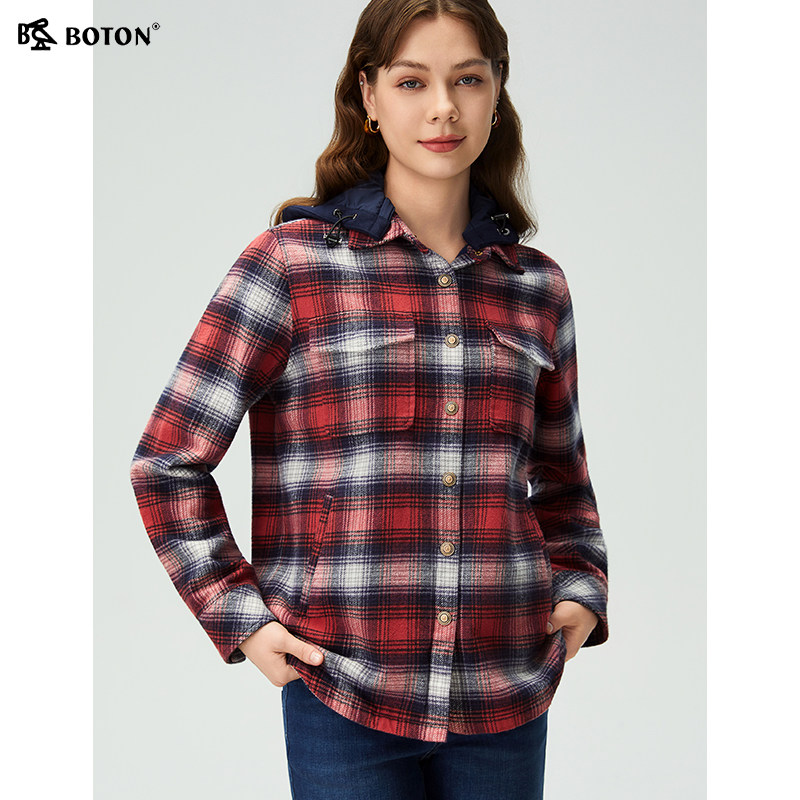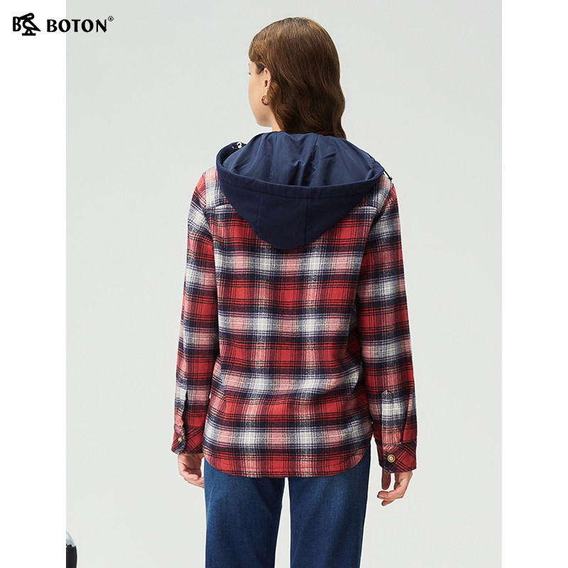 波顿秋季新款宽松可拆帽格子衬衫型外套修身百搭女士长袖磨毛衬衣