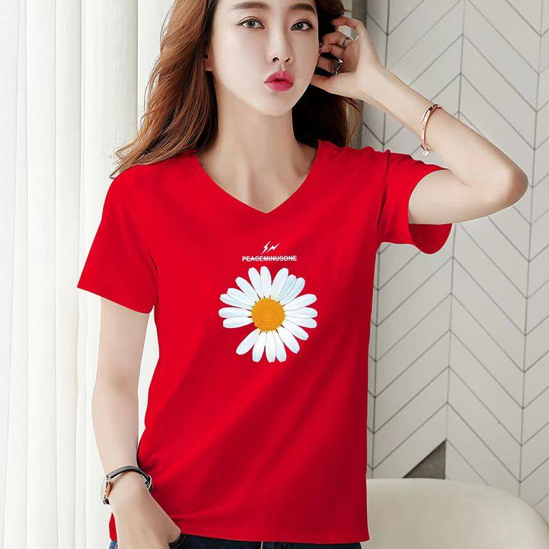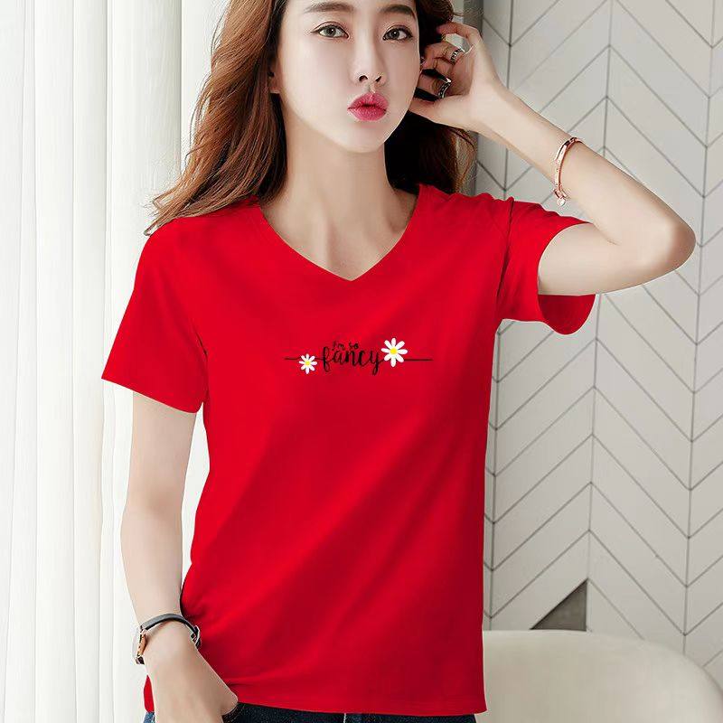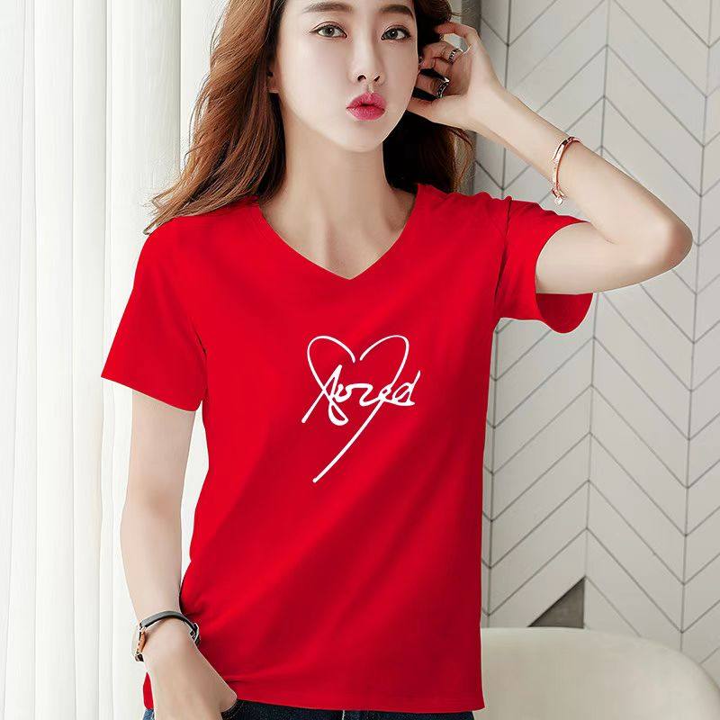 时尚韩版新款大红色V领鸡心领T恤女短袖半袖简约休闲印花宽松夏装
