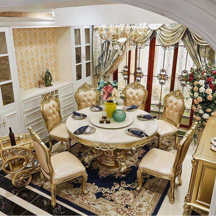 欧式圆餐桌椅组合全实木雕花餐桌饭桌法式大理石圆餐桌