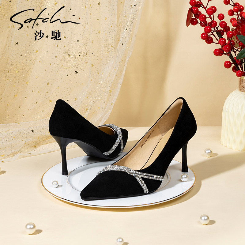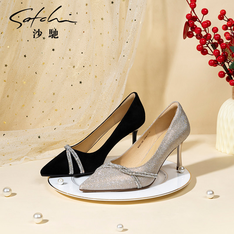 沙驰女鞋细跟高跟职业女单鞋2025秋季新款尖头浅口闪钻新娘鞋婚鞋