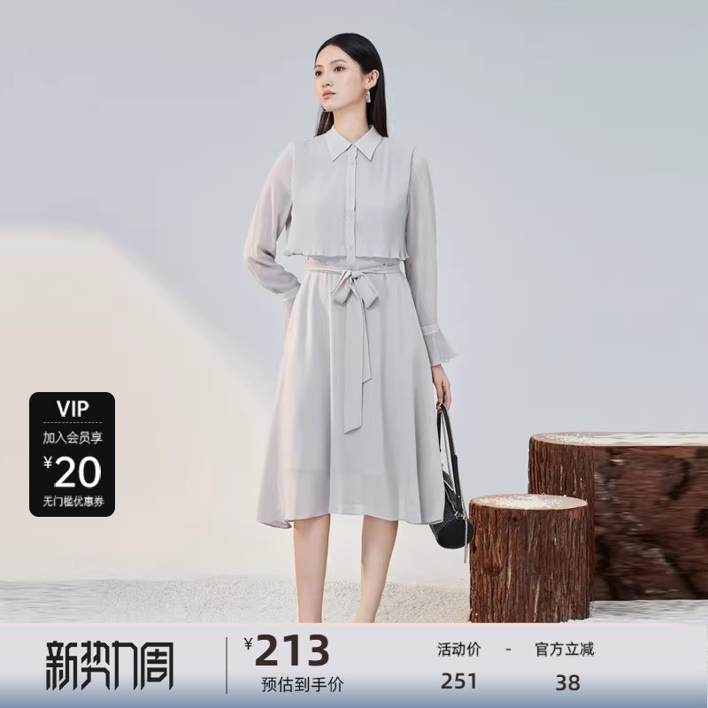 sdeer圣迪奥女装秋风琴褶收腰雪纺衬衫连衣裙S223Z123L