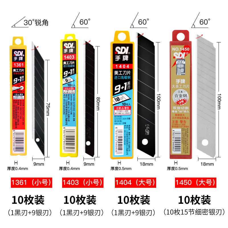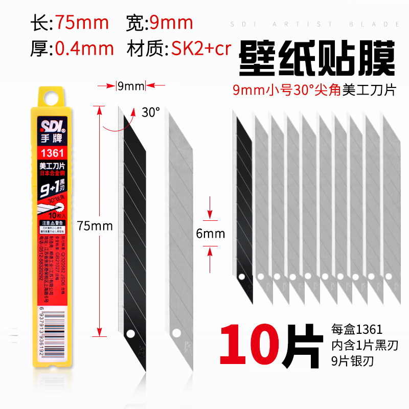 SDI手牌1361美工刀片30度尖刀片小号美工刀片雕刻刀片手机割贴膜9mm小号黑刃汽车贴膜墙壁纸布皮革刀片小刀架