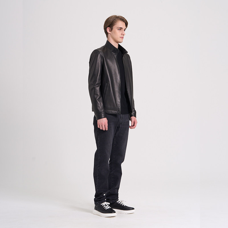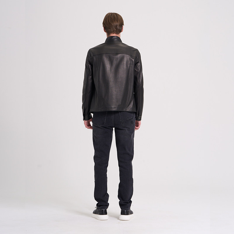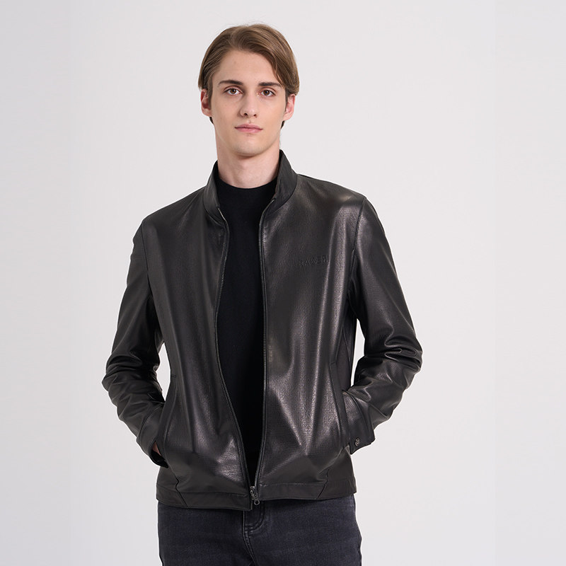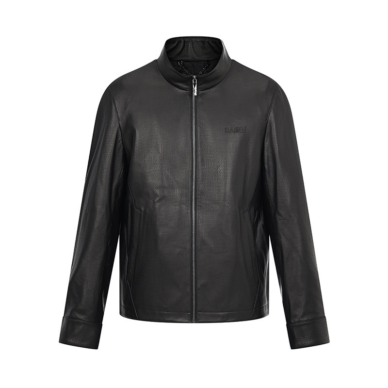 RARE威雅男装 秋冬新款小肌理压纹黑色男士立领夹克皮衣外套