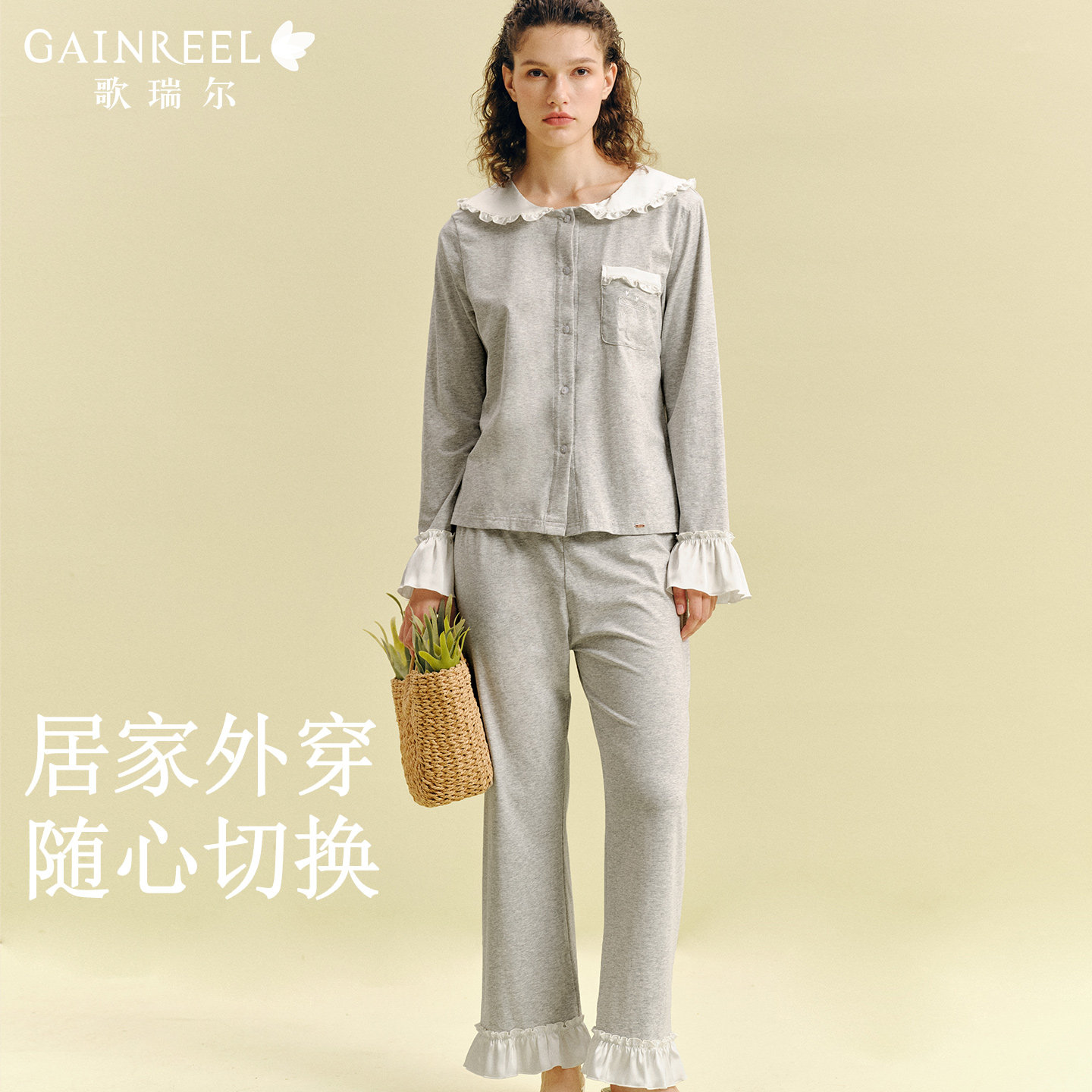 歌瑞尔可外穿家居服亲肤棉质睡衣女款秋长袖长裤套装娃娃领公主袖
