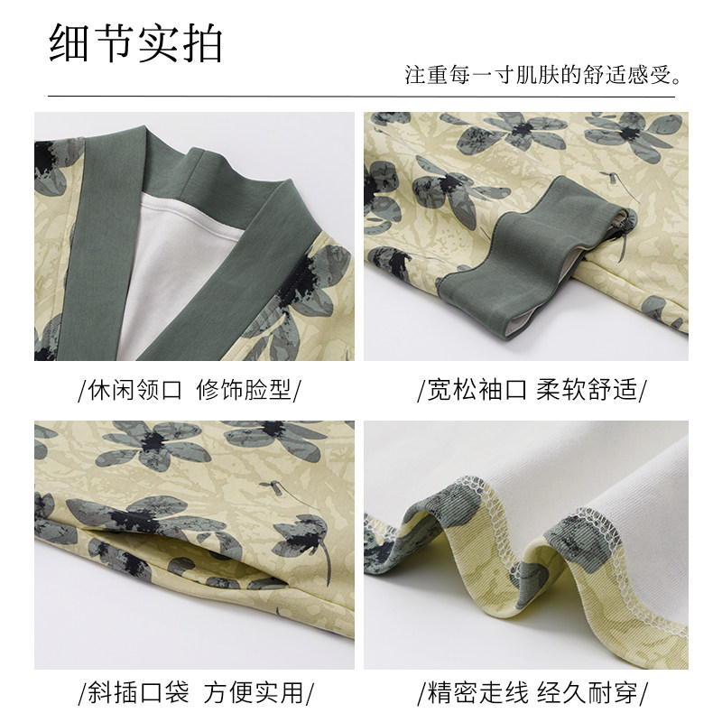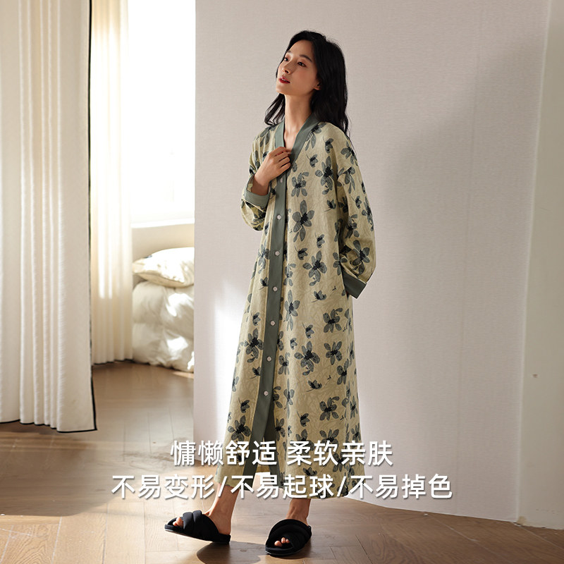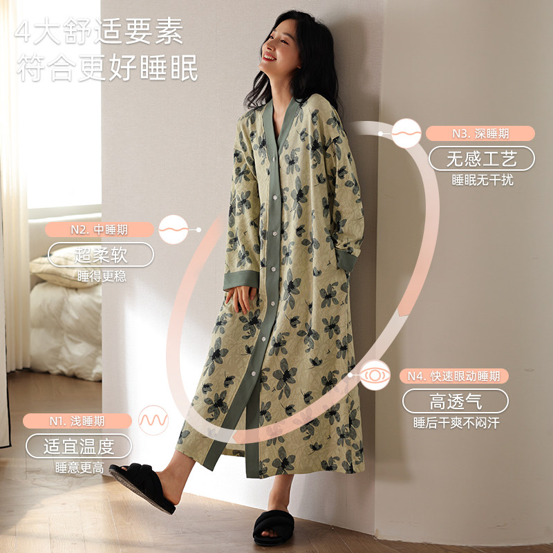古今睡裙女春秋纯棉长袖睡衣中长款大码全棉睡袍开衫连衣裙家居服