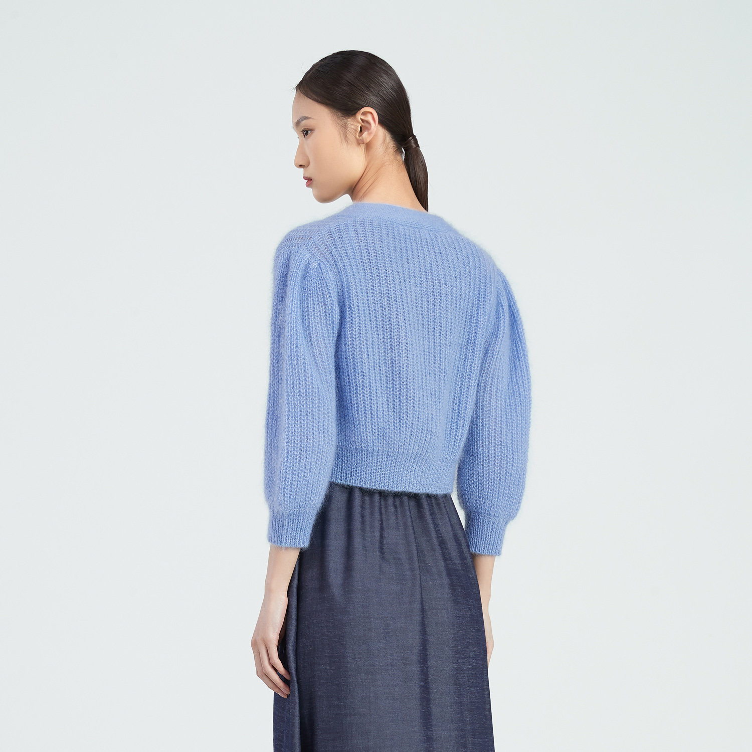 OVV春夏热卖女装马海毛羊毛混纺泡泡七分袖短款针织开衫外套
