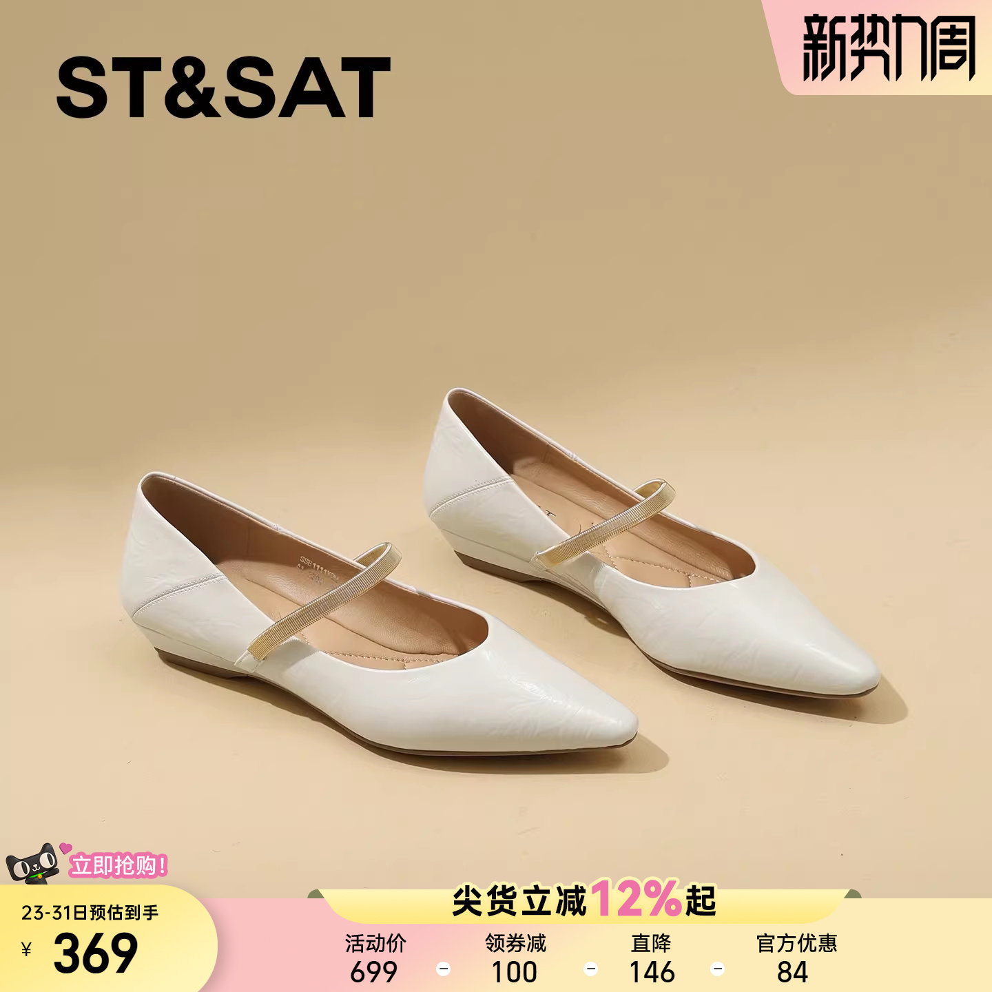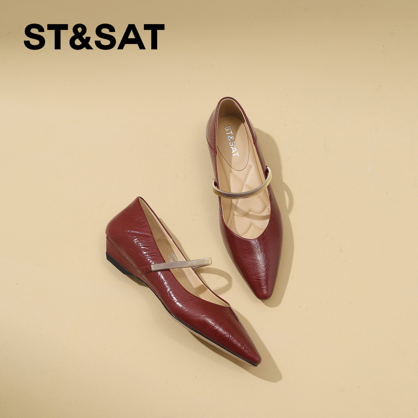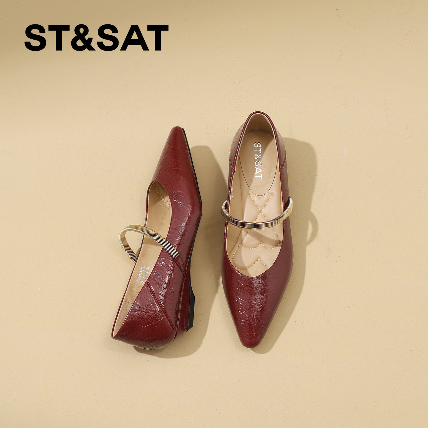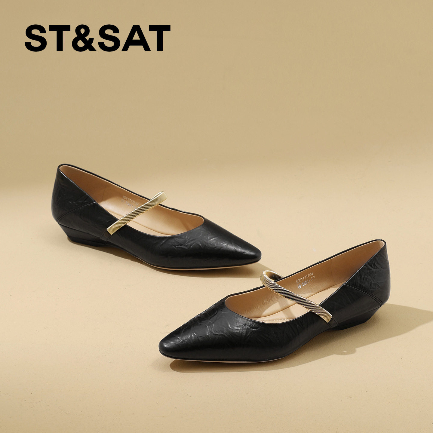 星期六精致尖头真皮坡跟浅口单鞋女2026年春季新款一字带玛丽珍鞋