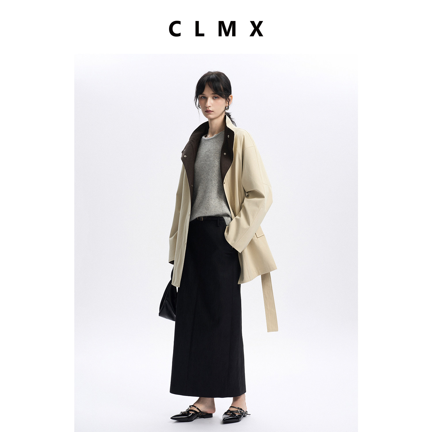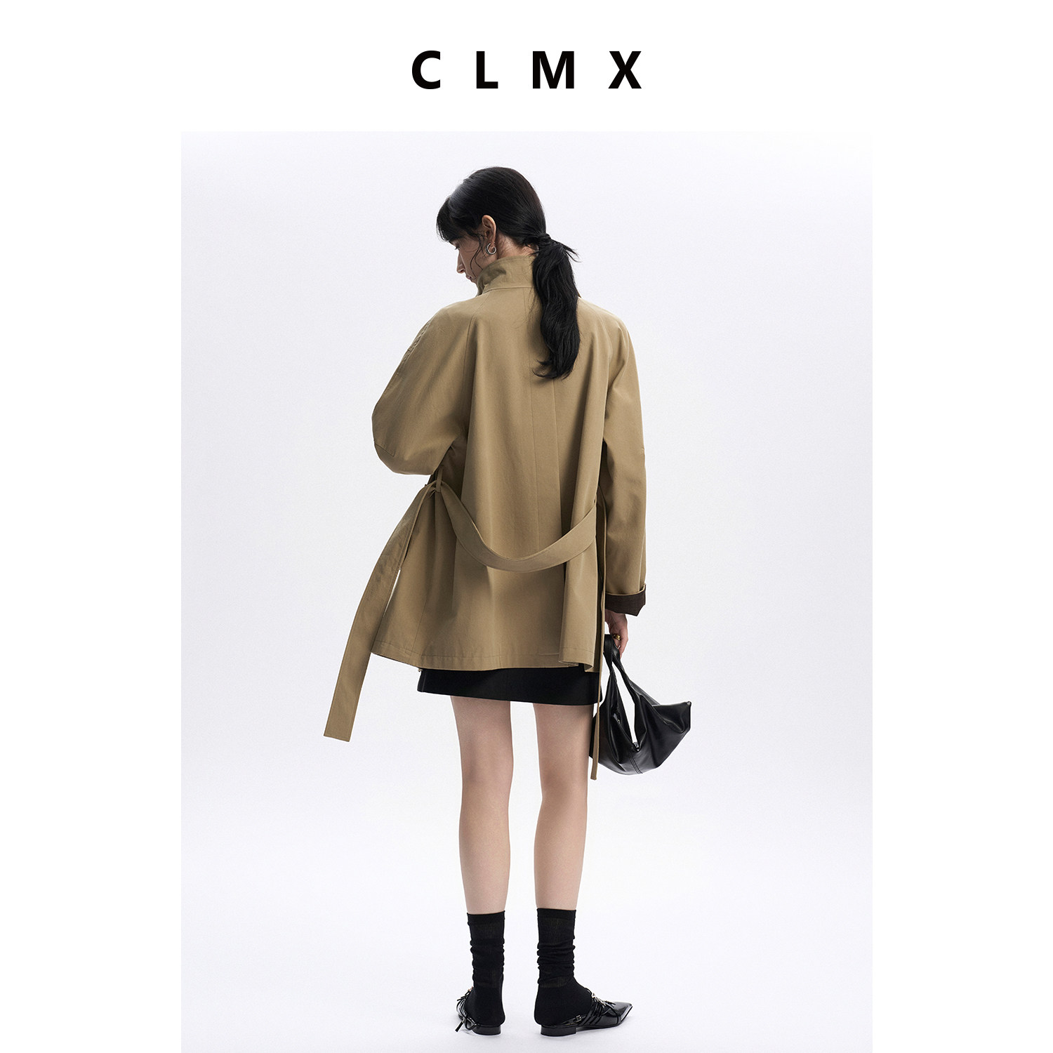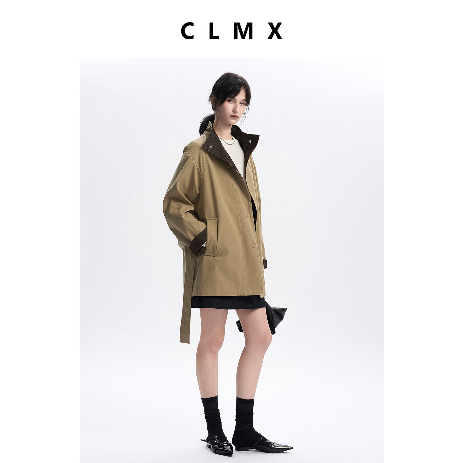 CLMX复古翻立领插肩袖宽松风衣水洗全棉挺阔宽松通勤上衣外套女