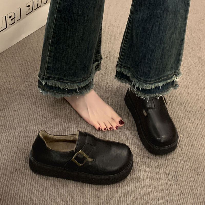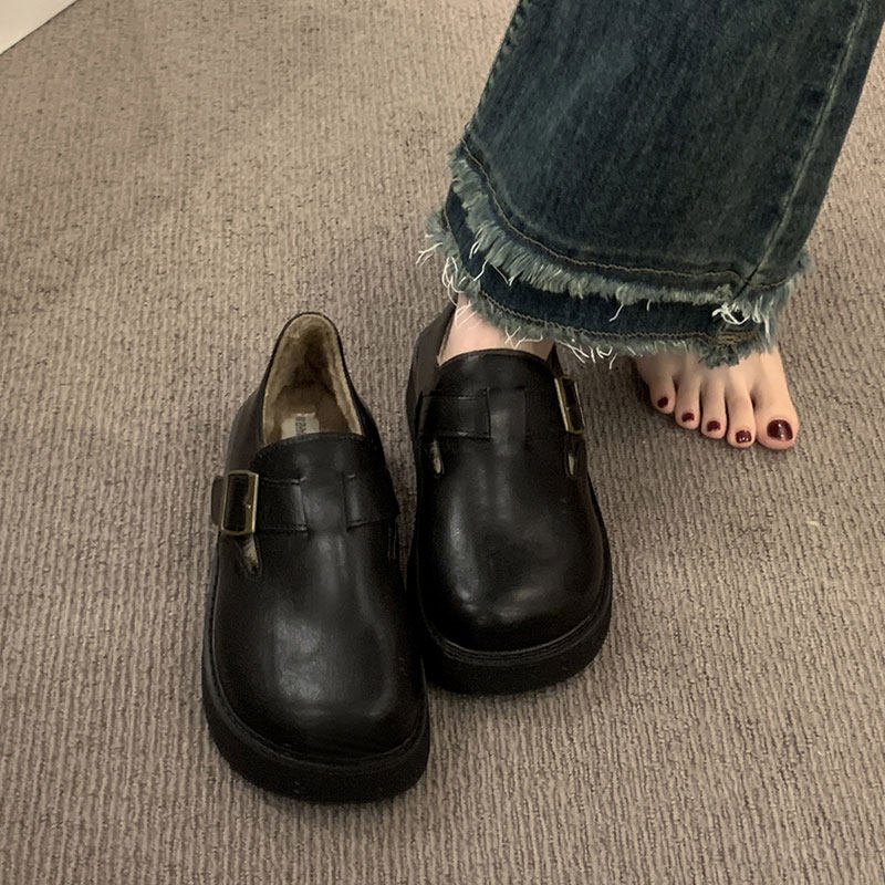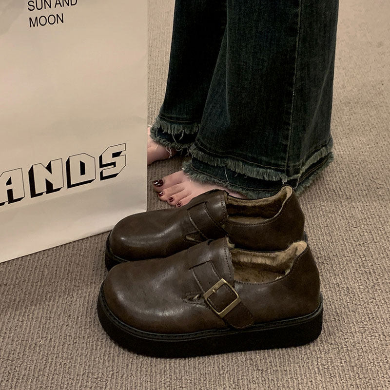 TATAFOCUS~加绒毛毛鞋韩版圆头皮带扣2025冬季新款勃肯鞋女35-28