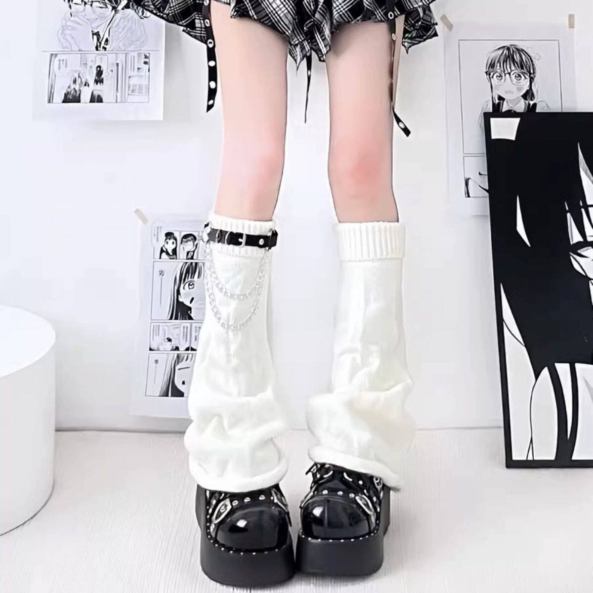 链条jk皮扣针织中筒堆堆袜套女显瘦腿套辣妹y2k亚文化喇叭袜黑色