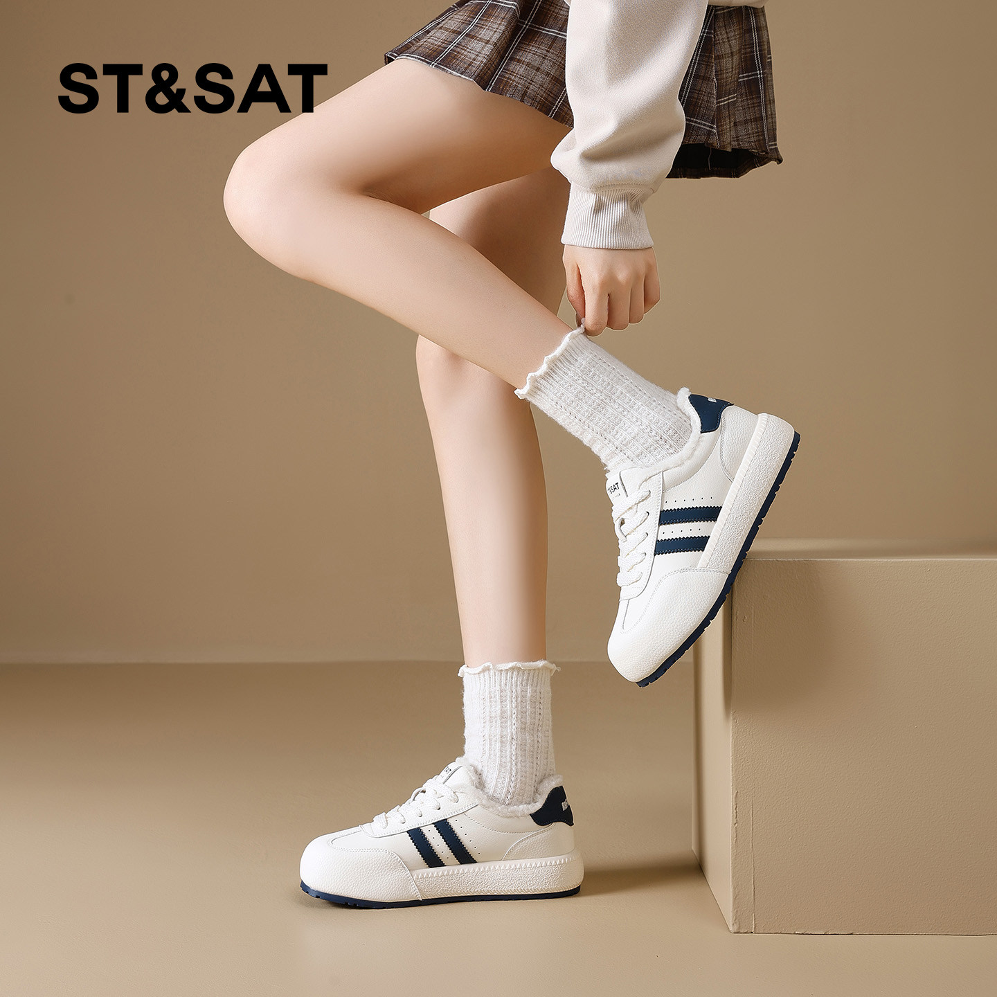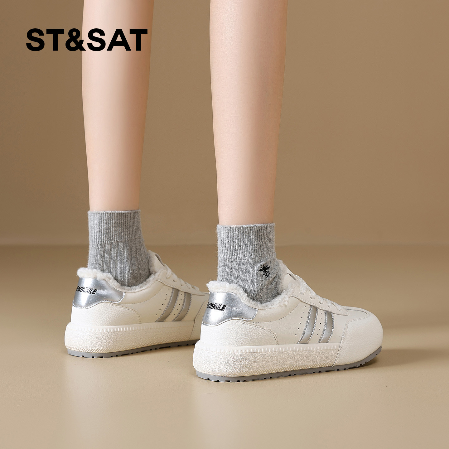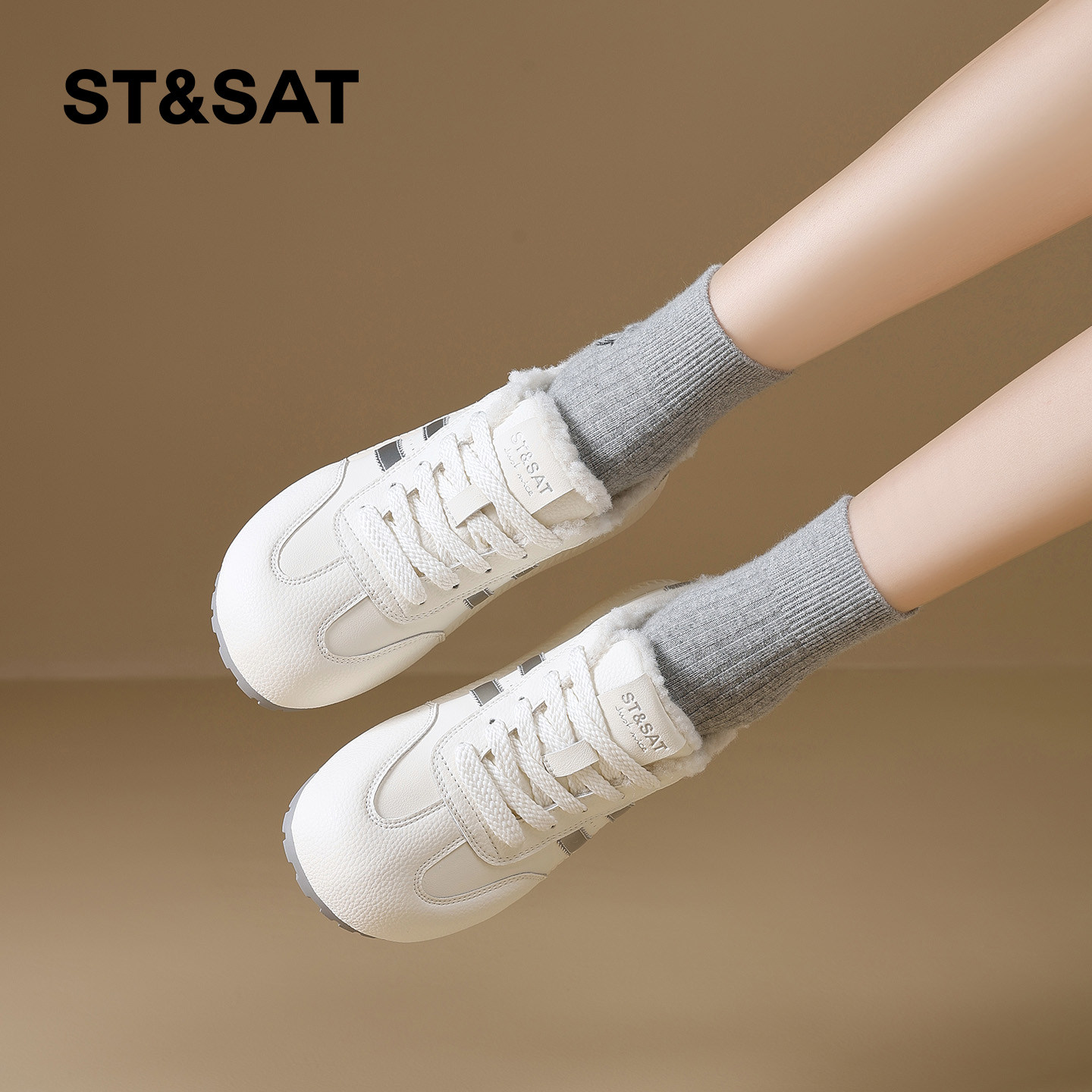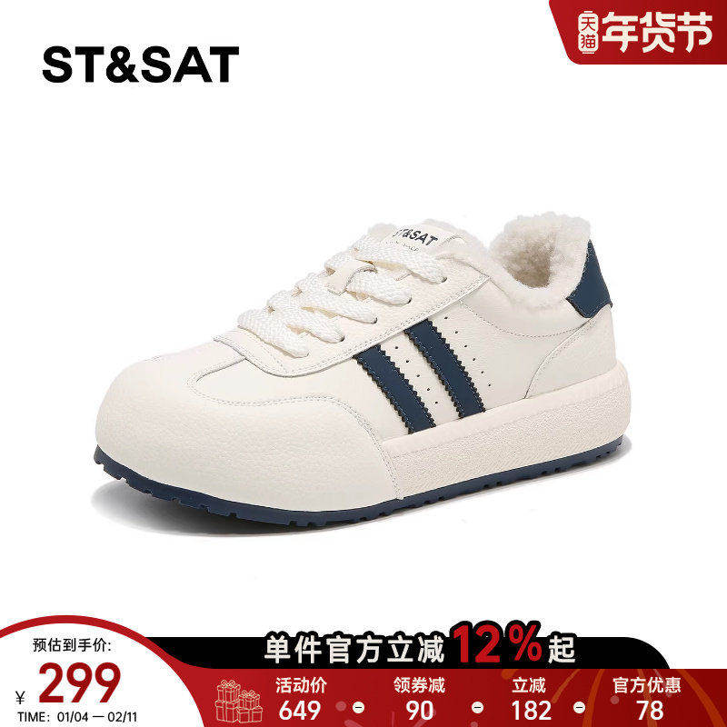 星期六加绒德训鞋女厚底2025新款冬季保暖休闲小白鞋舒适毛毛板鞋