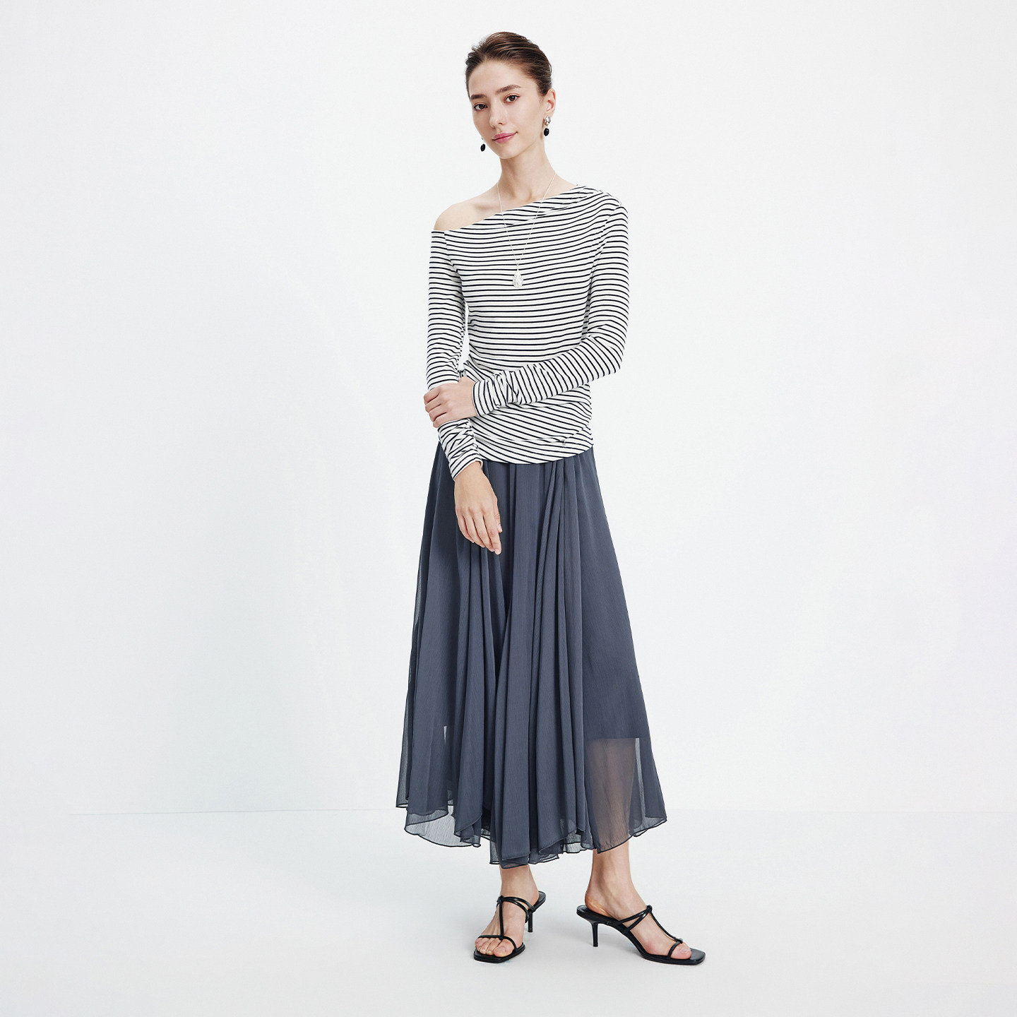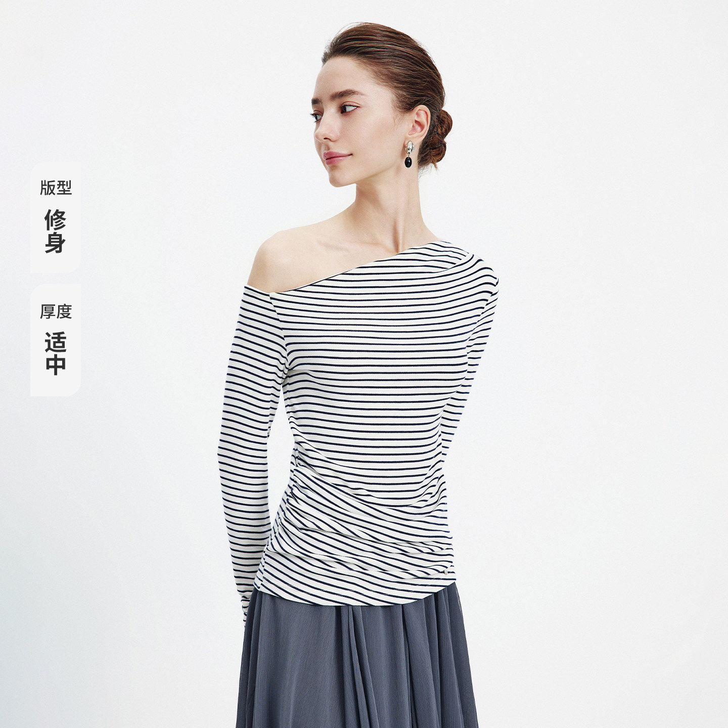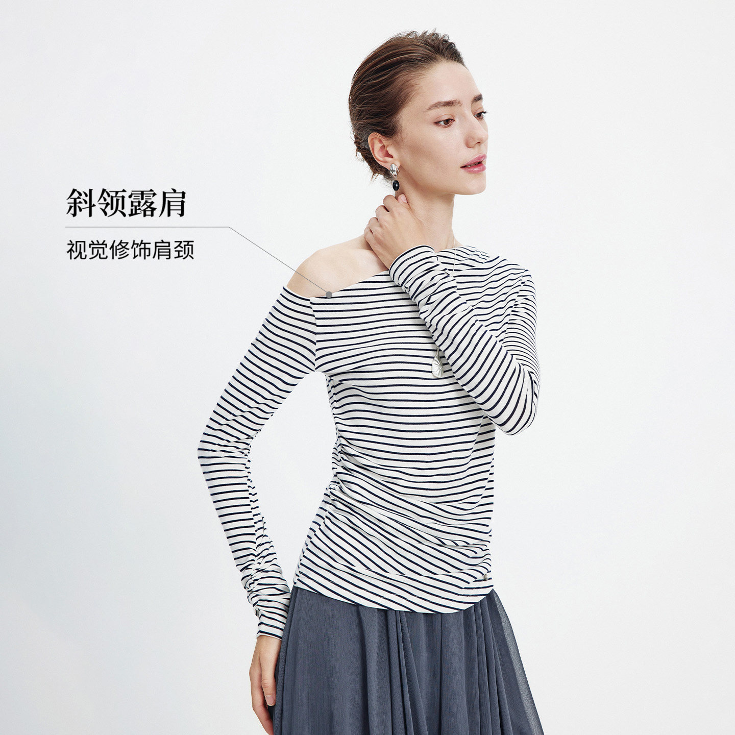 Navigare意大利小帆船露肩条纹长袖T恤女2026春季修身套头体恤衫