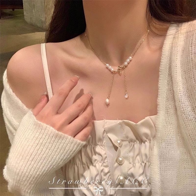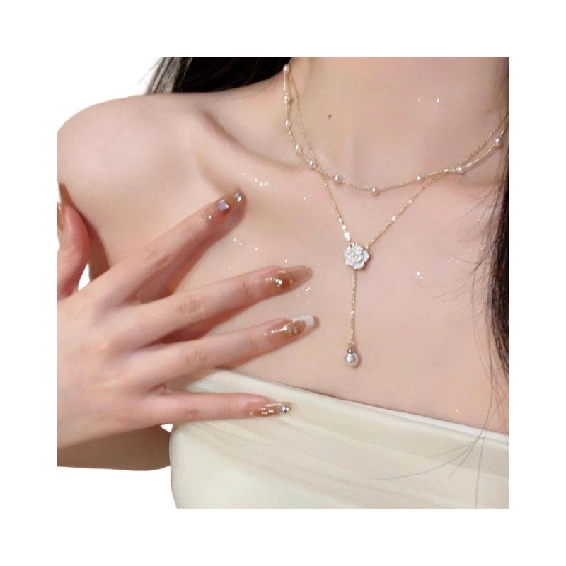 双层流苏珍珠项链女山茶花小众锁骨链轻奢高级感脖颈链蝴蝶满天星