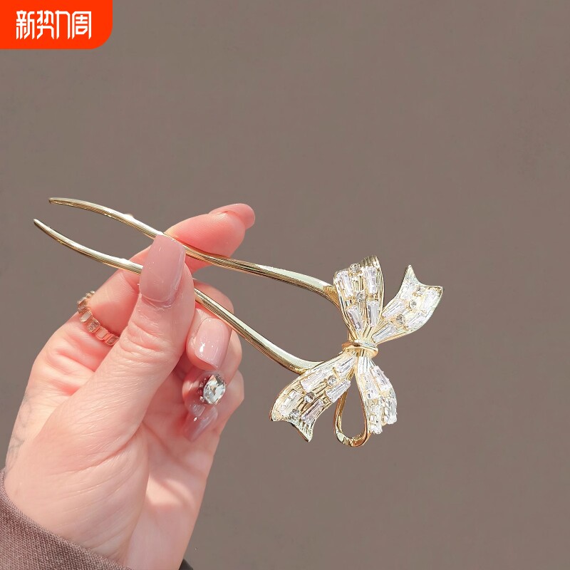 蝴蝶结发簪女高档锆石金色u型发钗2024新款后脑勺盘发器日常簪子