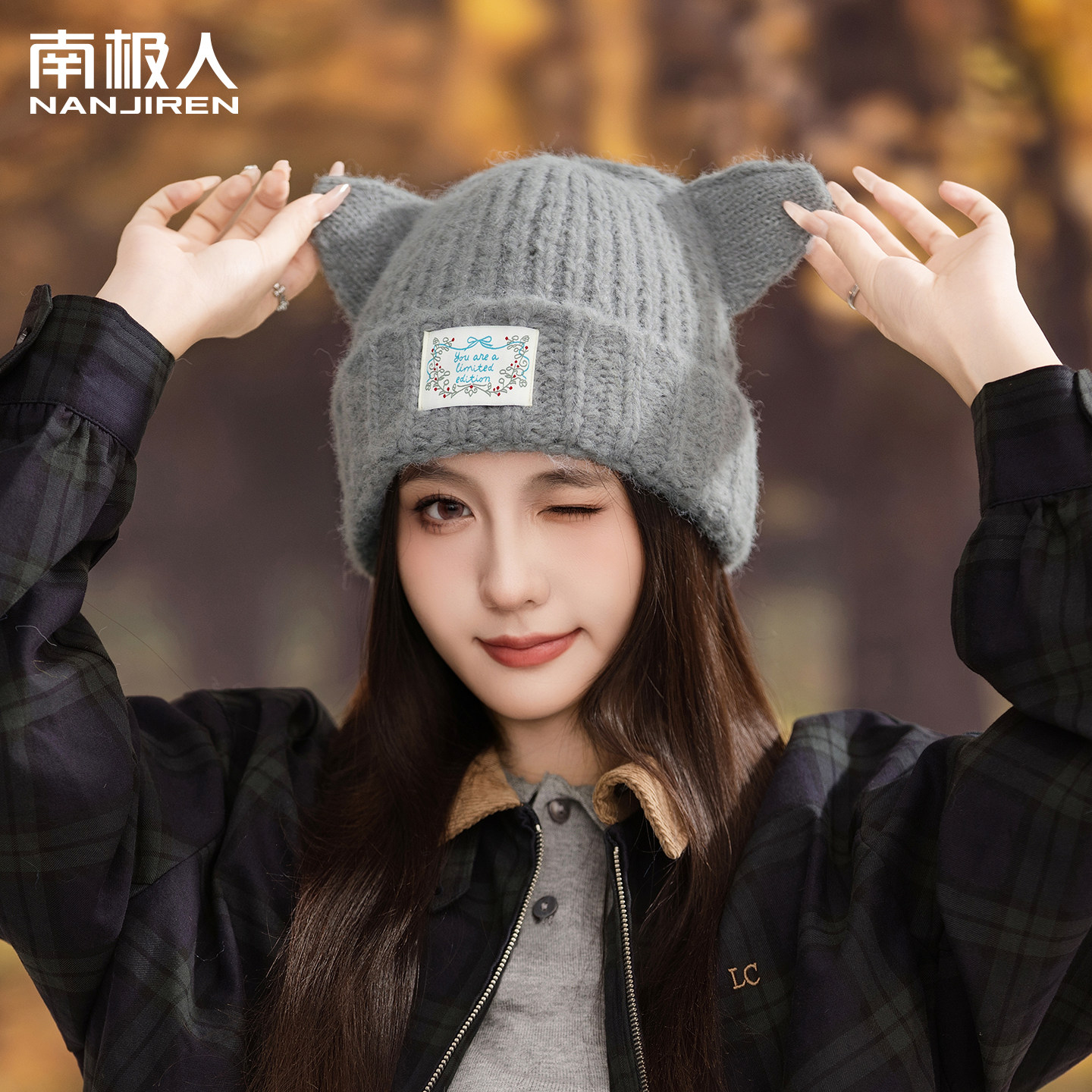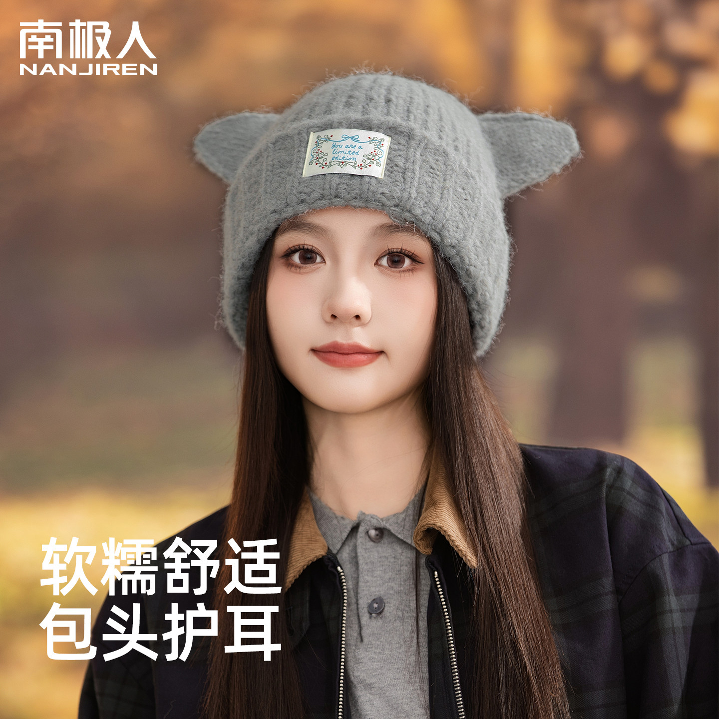 针织帽子女士秋冬季保暖猫耳毛线帽户外骑行防风防寒可爱包头帽J