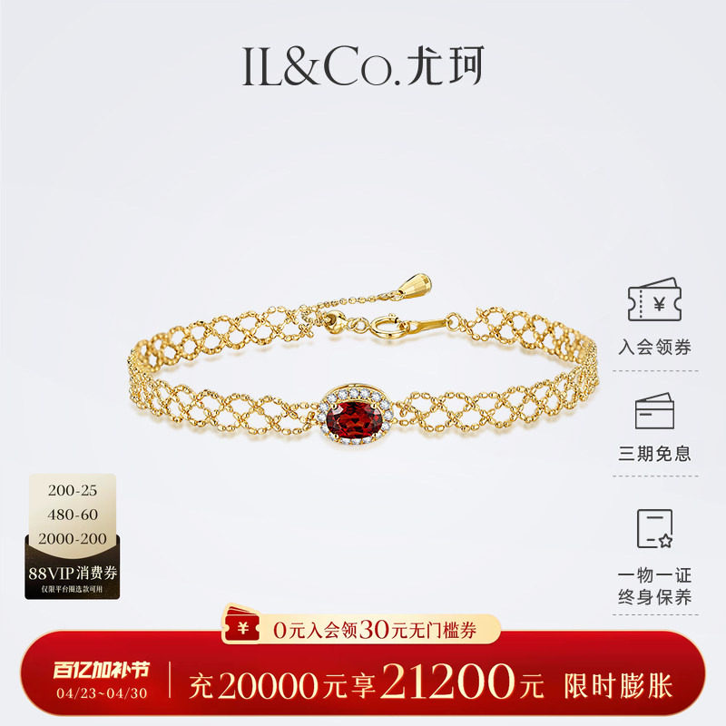 ILCO尤珂「花丝蔻 」黄18K金天然石榴石钻石围镶镂空编织设计手链