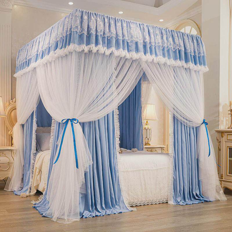 双层家用公主风三开门蚊帐床幔落地式遮光床帘四季通用遮光防尘顶