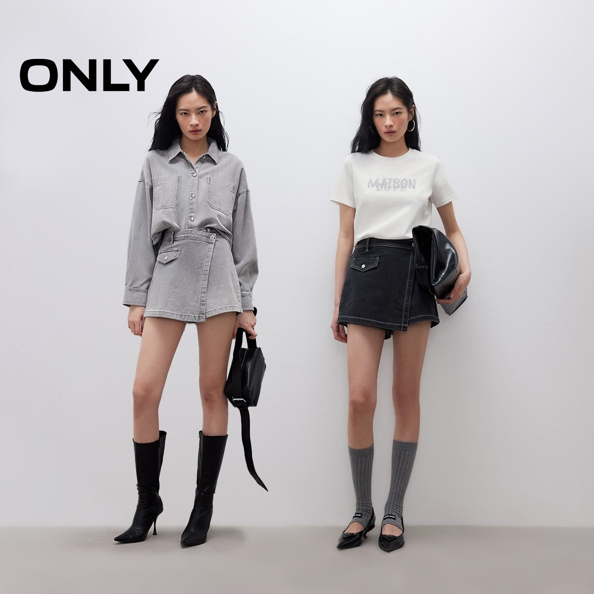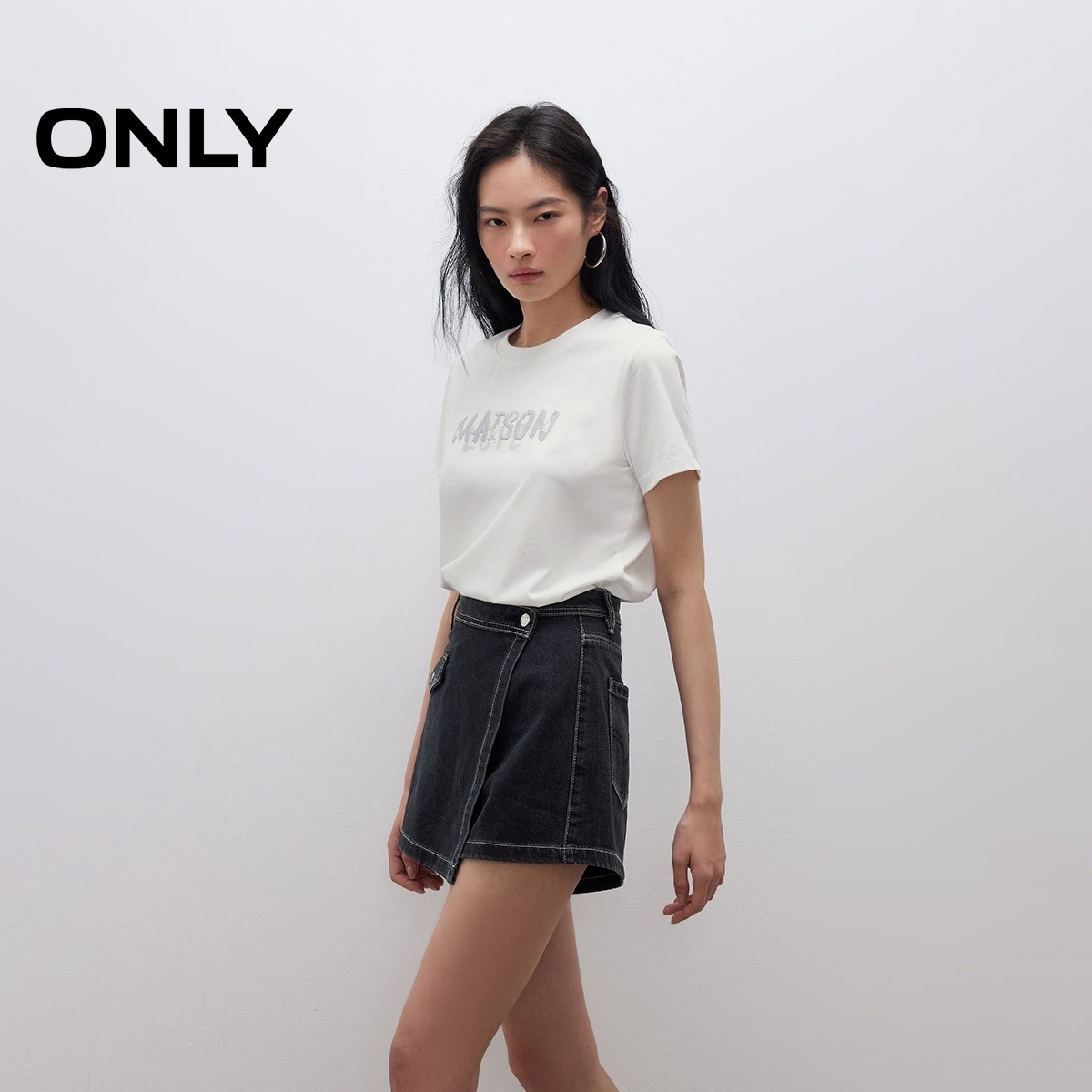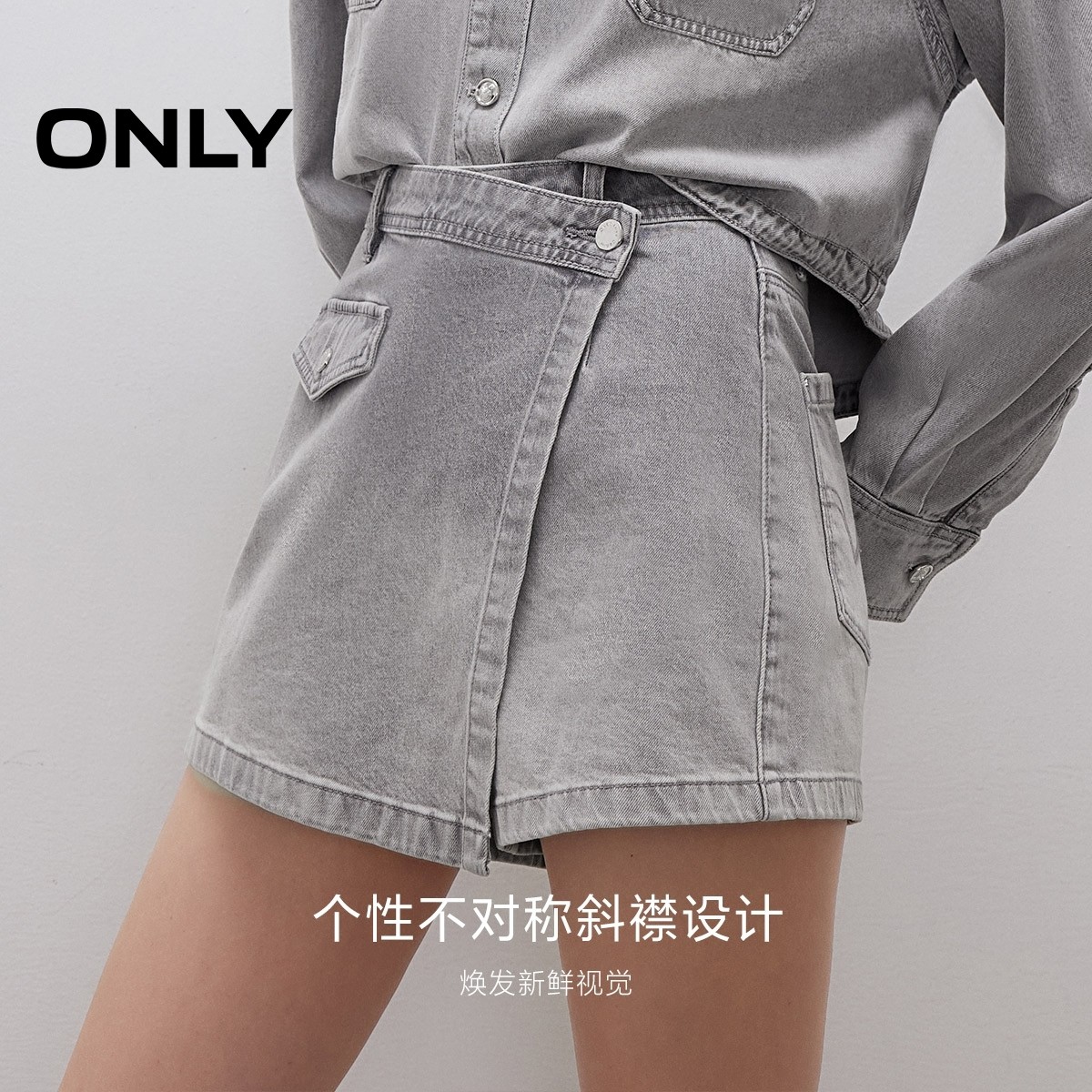 ONLY2026春季新款个性水洗设计感不对称斜襟A字裤裙短裤牛仔裤女