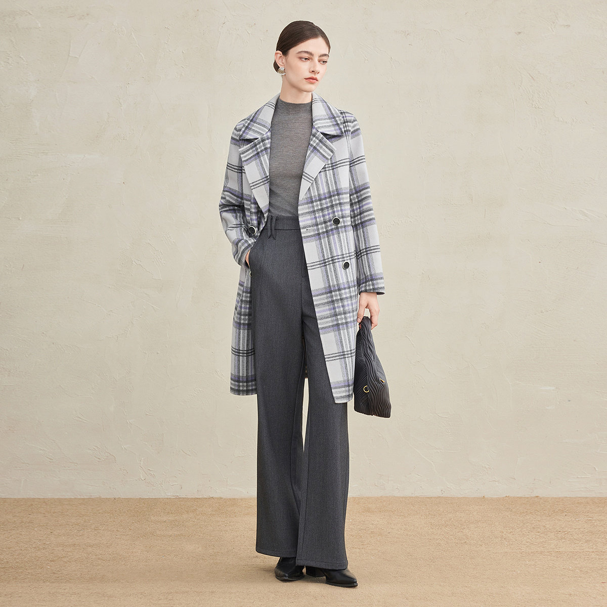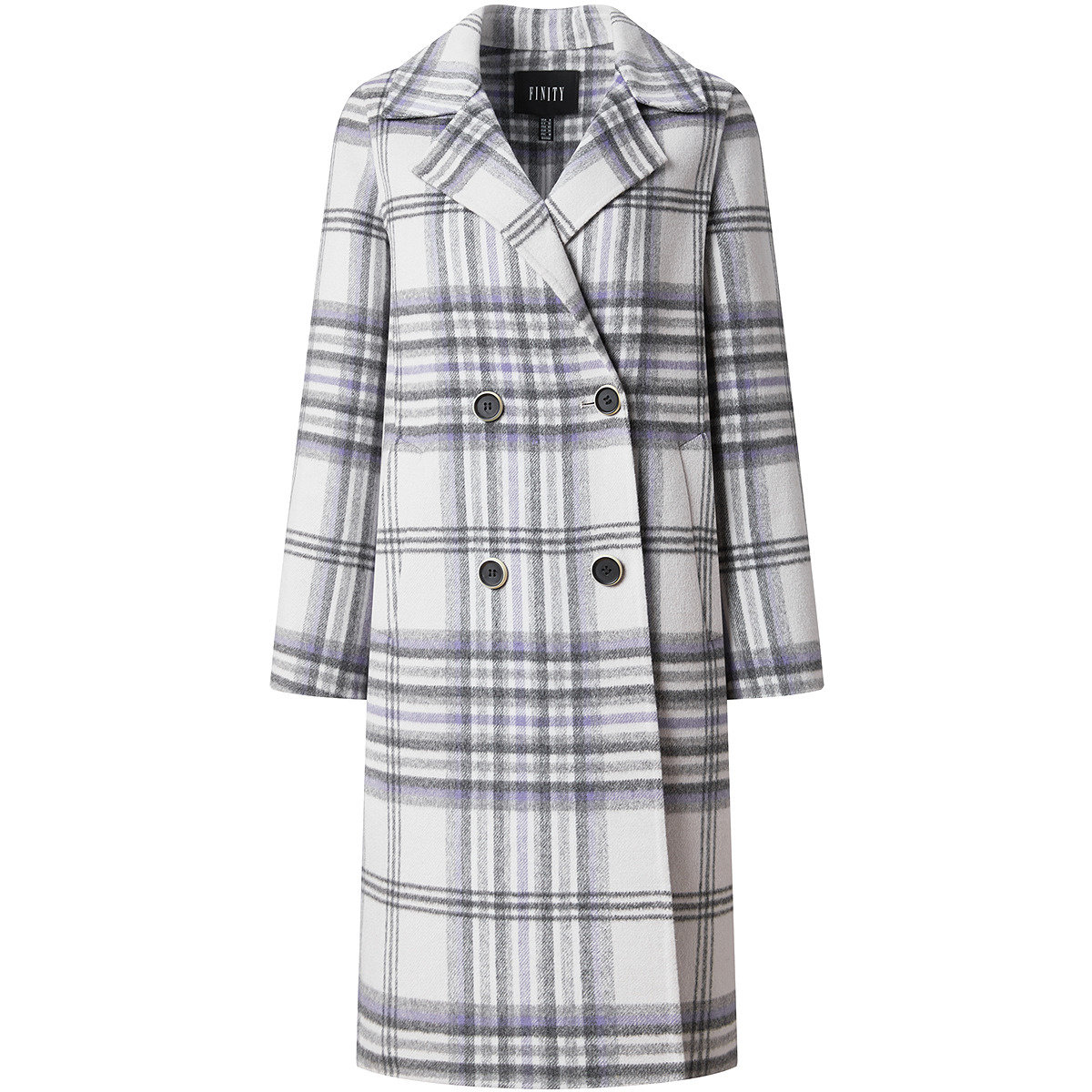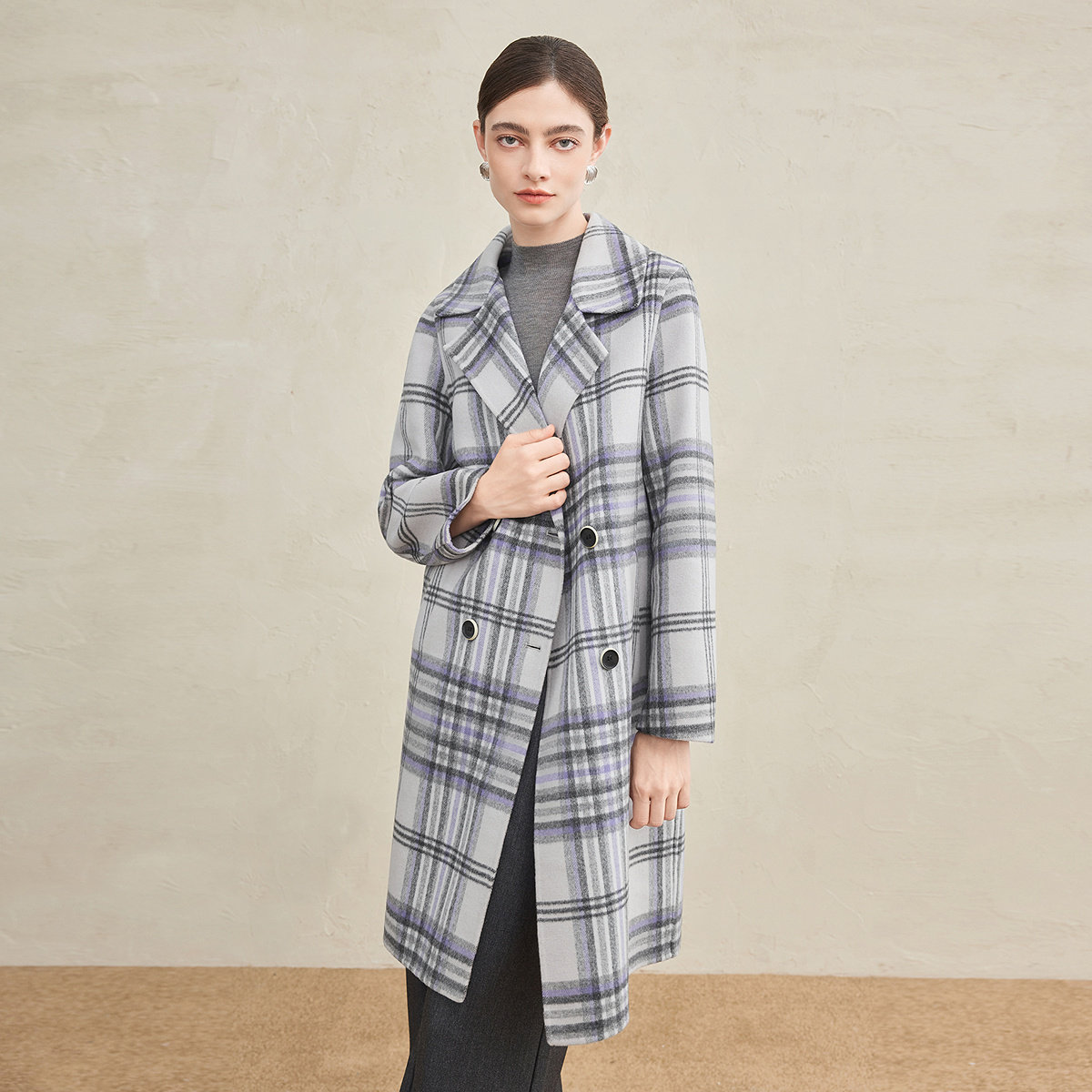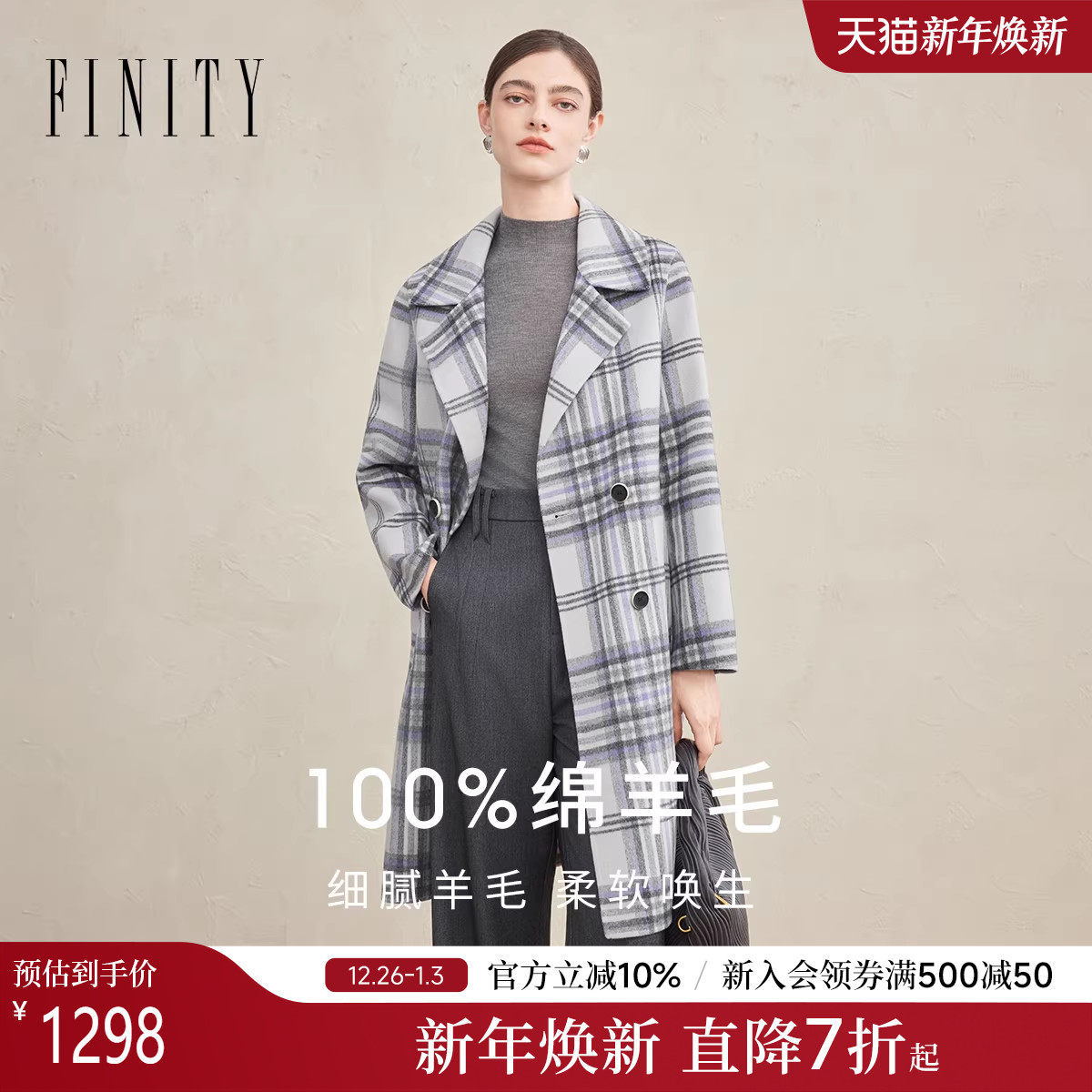 FINITY菲妮迪毛呢外套2025年冬季新款简约紫灰格子双面呢大衣女士