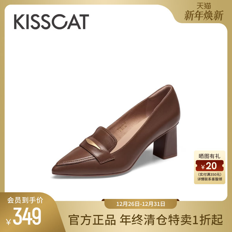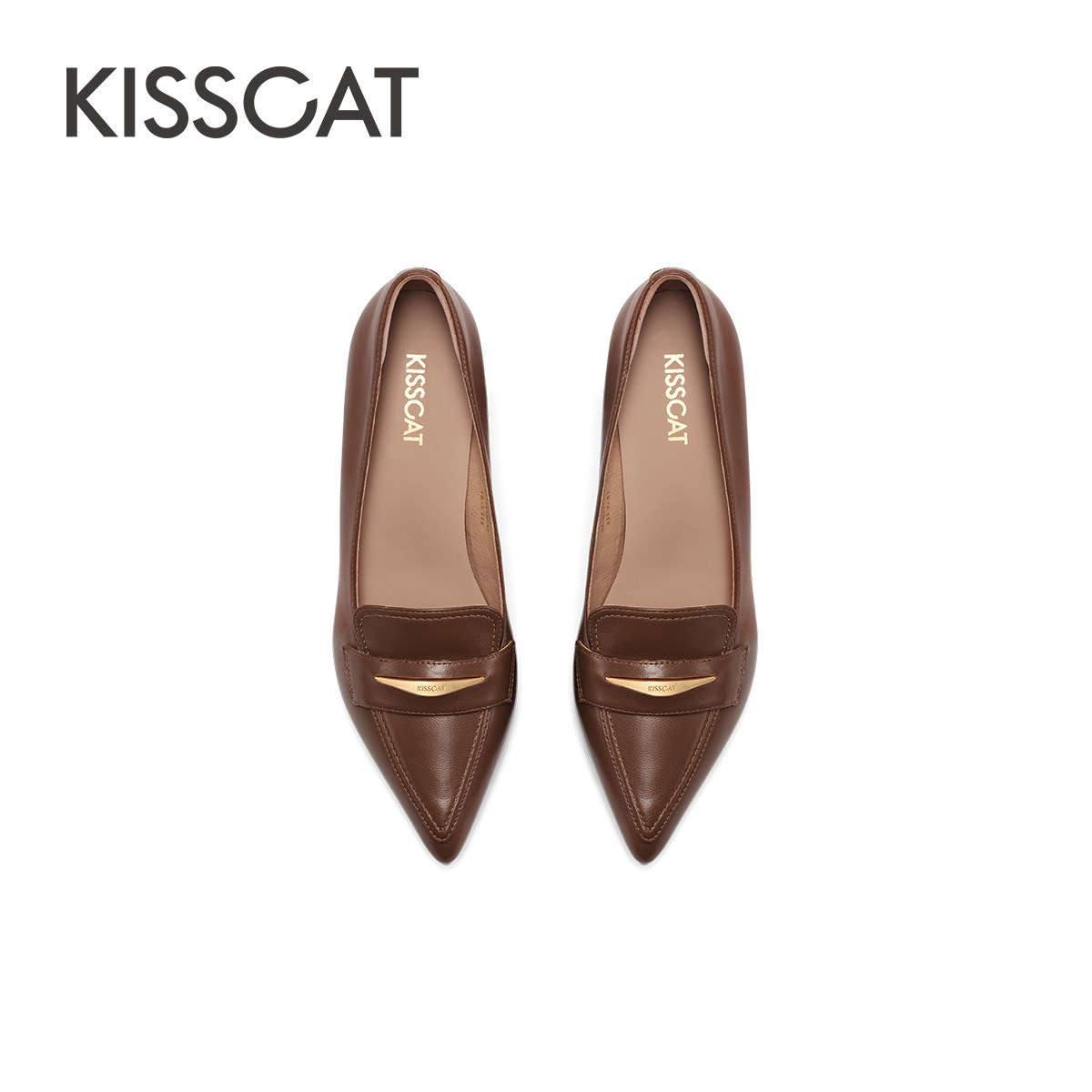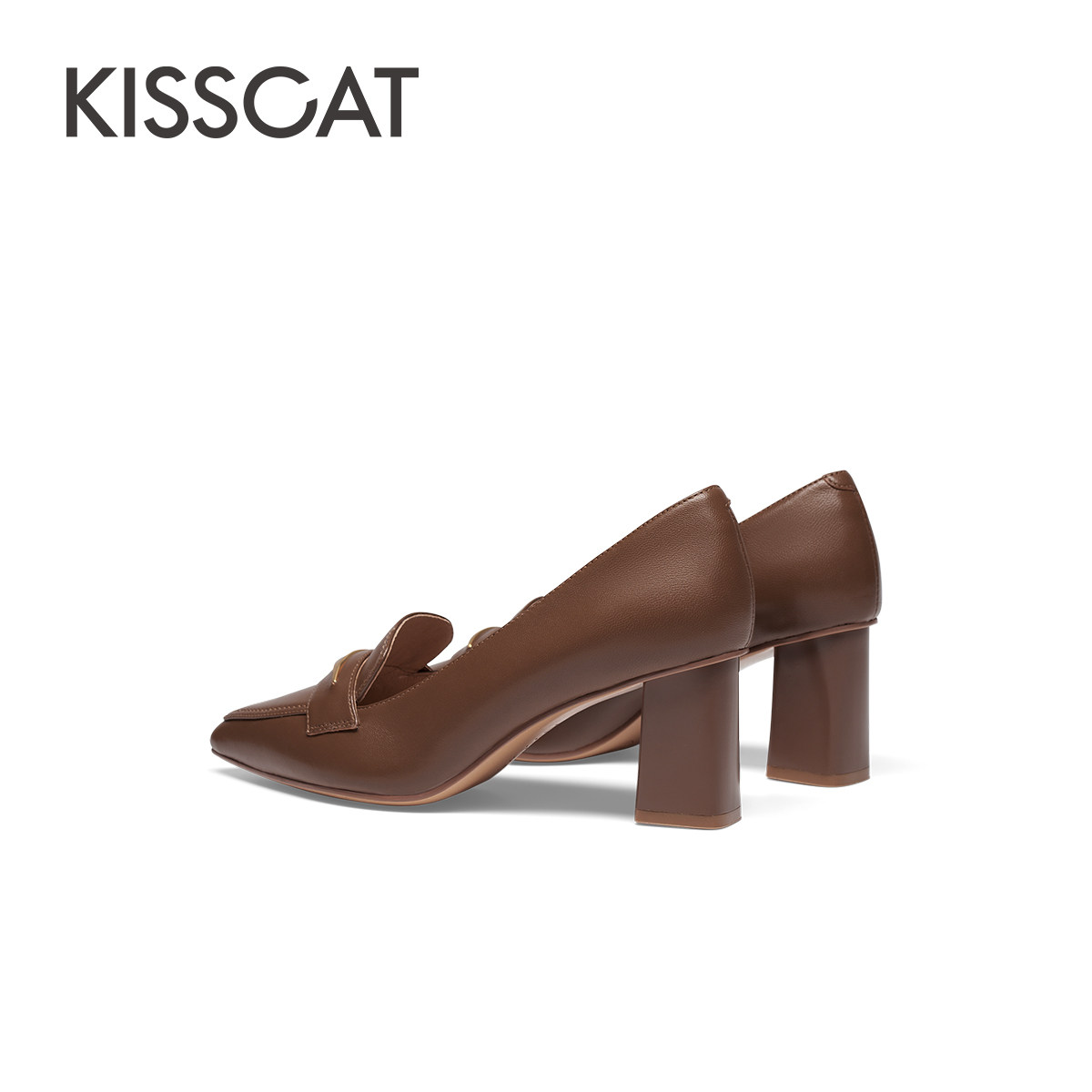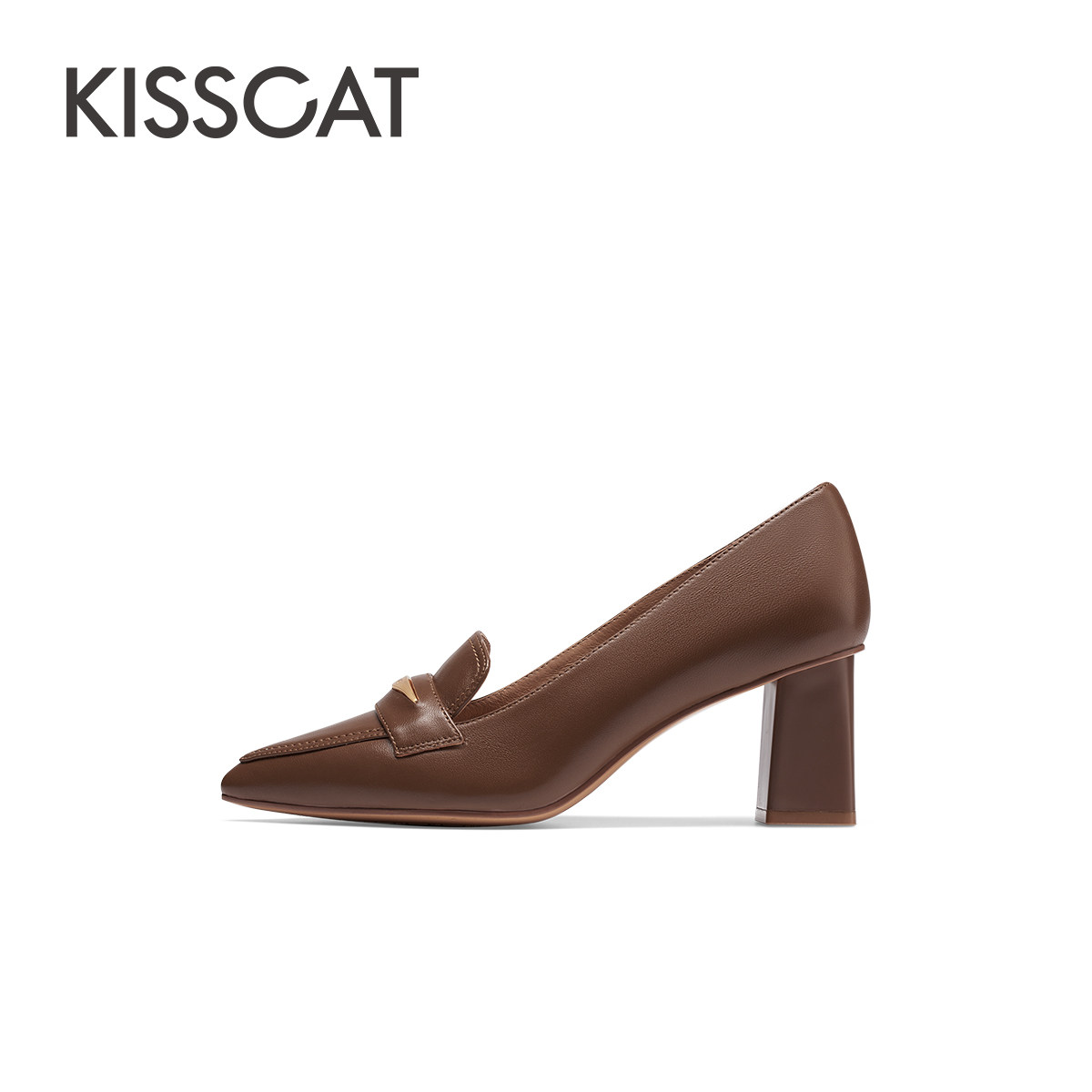 接吻猫秋季款老钱风金属扣尖头高跟鞋粗跟不累脚时装乐福鞋女