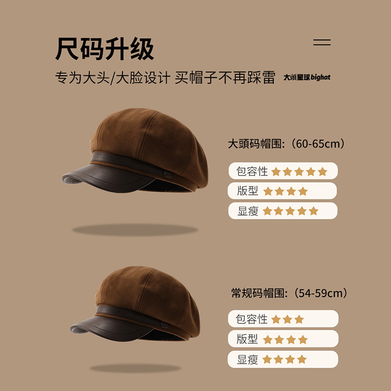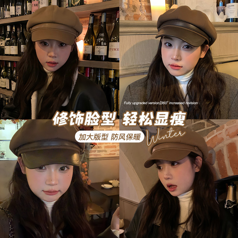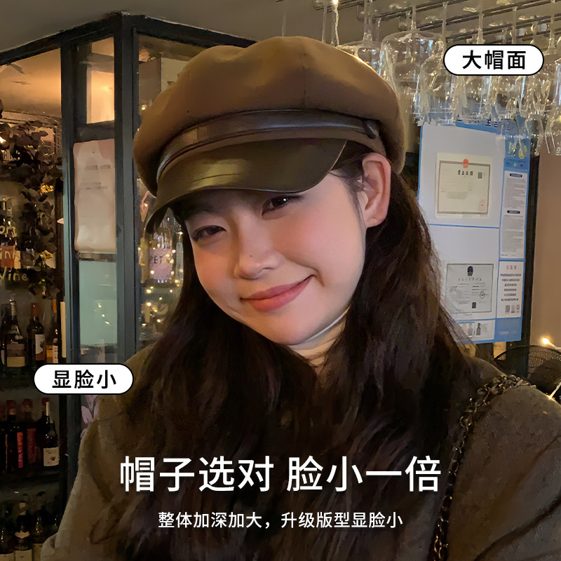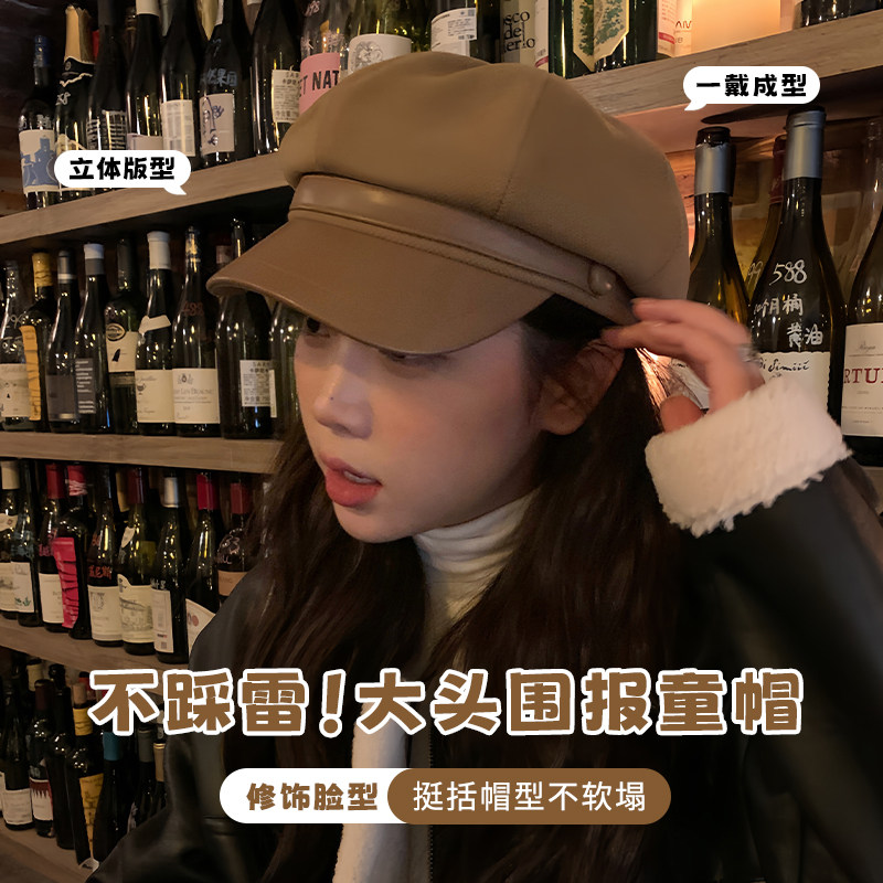 日系2025新款毛呢鸭舌报童帽大头围云朵八角帽PU皮质帽子画家帽女