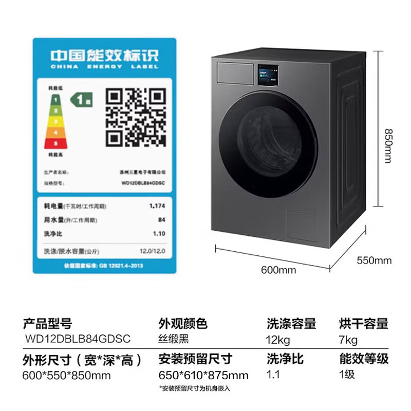 三星AI神7系12kg大容量洗衣机洗烘一体亲宠国家补贴黑B84GD