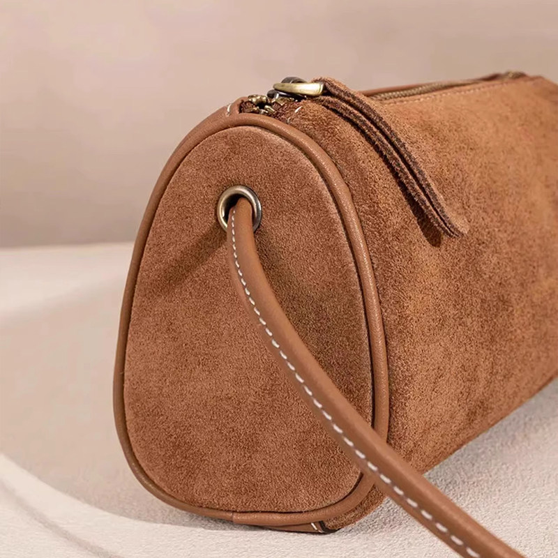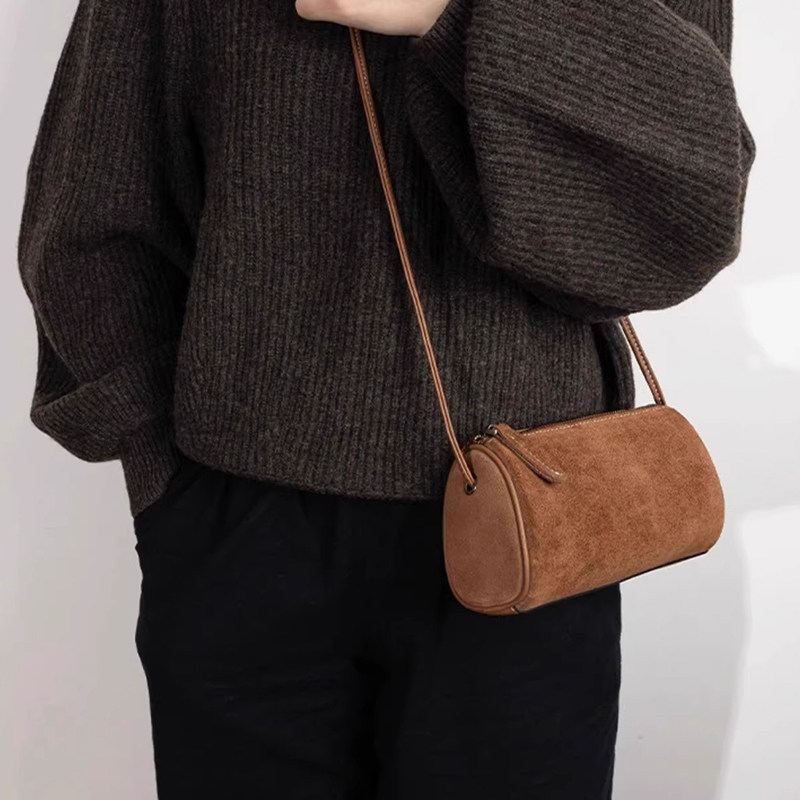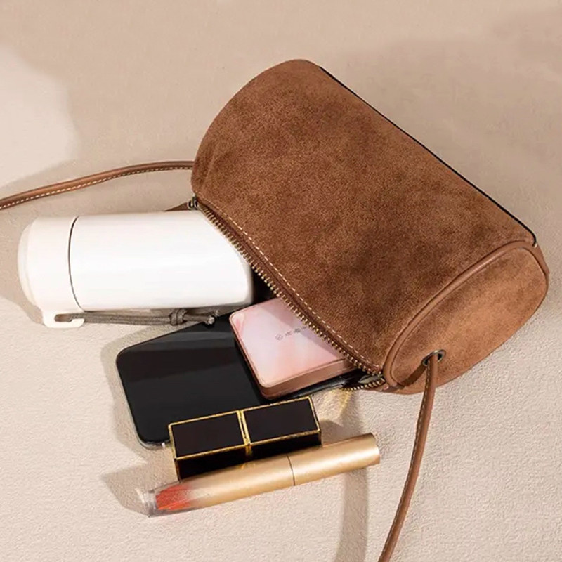 秋冬季小众手机包时尚休闲复古绒面软皮圆筒包水桶包单肩斜跨女包