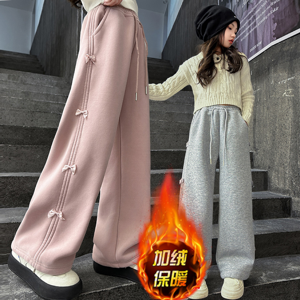 女童裤子加绒秋冬洋气卫裤2025潮秋季休闲裤儿童长裤阔腿粉色蝴蝶