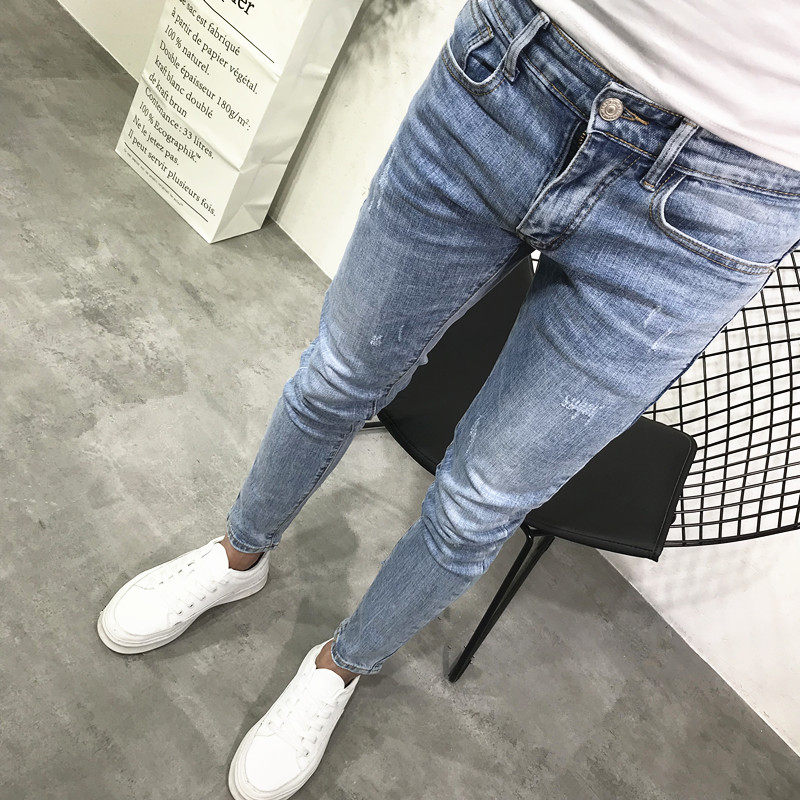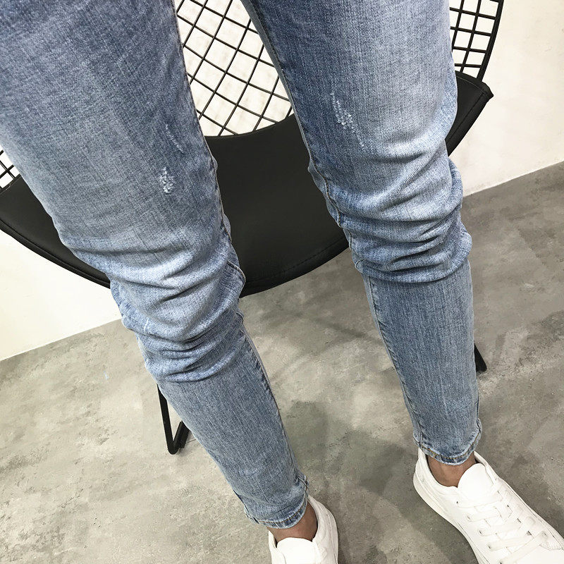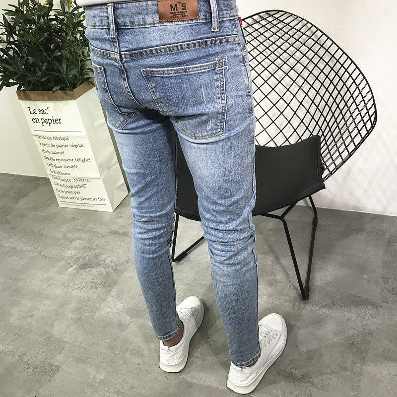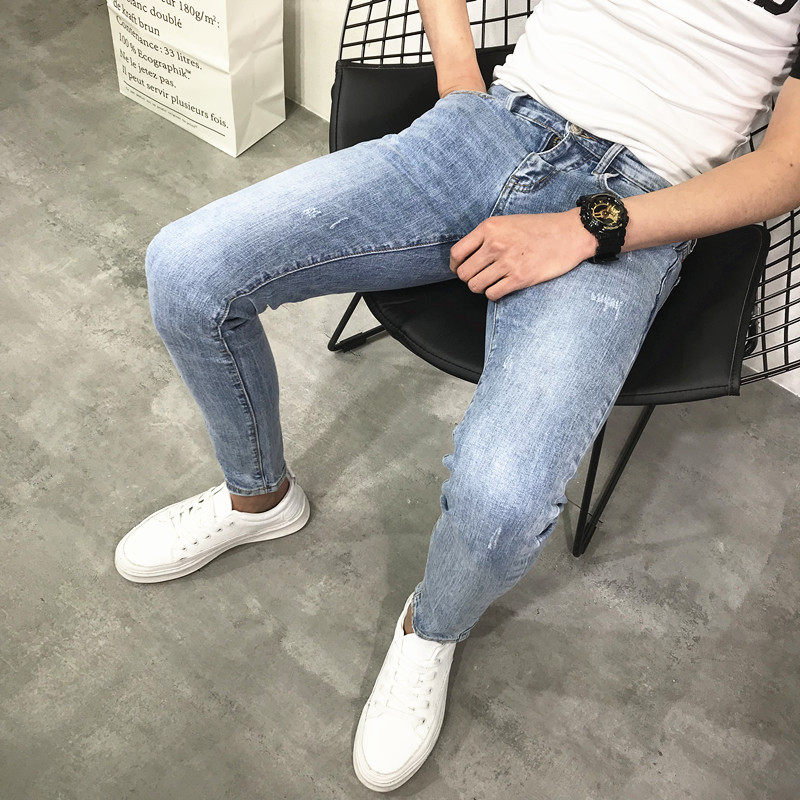 潮男夏新韩版修身弹力九分浅蓝小脚牛仔裤社会人青年快手抖音百搭