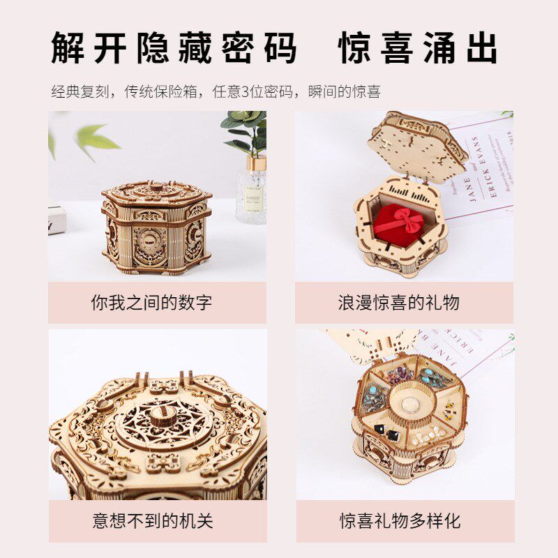 木质3d立体e拼图高难度手工拼装复古密码首饰盒八音盒益智玩具diy